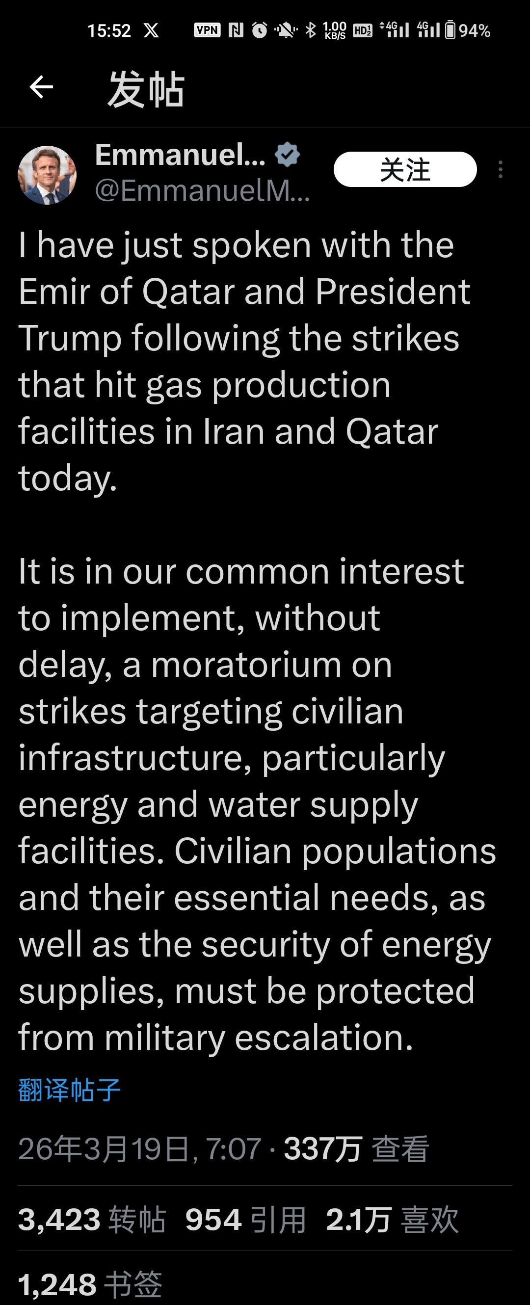 新闻快讯——美伊冲突升级:马克龙呼吁停击民用设施遭伊朗驳斥,海湾国家谴责伊朗行动 3月19日美伊冲突相关事态持续发酵,法国总统马克龙就伊朗与卡塔尔天然气设施遇袭事件,与卡塔尔埃米尔、特朗普通电话,呼吁立即暂停针对民用基础设施的打击,保护能源供应安全与平民需求;伊朗高级外交官阿拉格奇则严厉驳斥马克龙的表态,指责其对美以袭击伊朗燃料库、造成数百万人暴露于有毒物质的行为沉默,仅在伊朗实施报复后表达“关注”,存在双重标准;与此同时,沙特、卡塔尔等海湾国家也公开谴责伊朗的“侵略性行动”,认为其破坏了地区信任与安全格局。