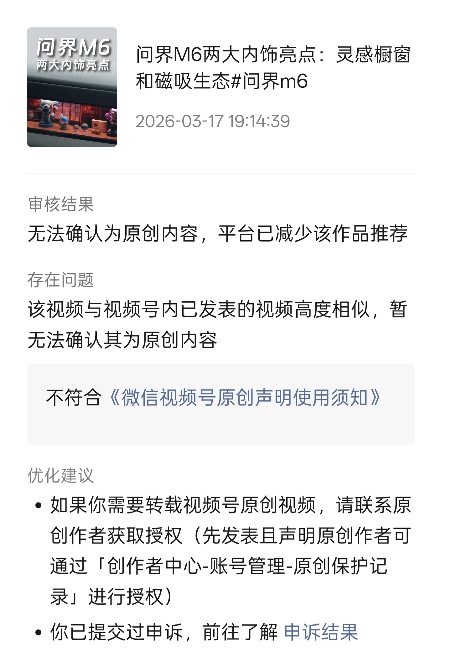同样都是问界 M6 的视频在视频号被判非原创,在抖音又被判涉嫌营销这咋回事?