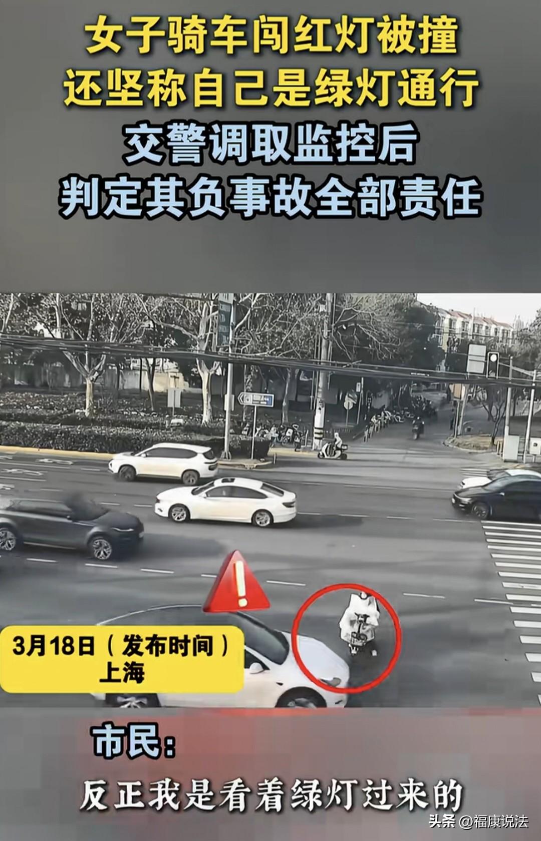 “无理赖三分?”上海,女子骑电动车看是绿灯,便横过马路,撞上一正常行驶的轿车,连人带车摔倒,交警到现场,判定女子负事故全责,女子狡辩:我看着绿灯过来的。交警:你人没下来时,已经翻红灯了!女子不服,交警拿出一个证据,让她傻了眼。 一路口人行道边,一女子骑着电动车横过马路,眼看着就要到对面了,突然,一辆白色小轿车过来,女子骑车迎面撞了上去,一瞬间,她和电动车直接摔倒在地…… 而后,交警来了之后,调取监控,说女子骑电动车闯红灯,判定女子负事故全部责任, 女子一下子就不服气了,凭啥啊,她立马狡辩道,反正我是看着绿灯过来的。 她的意思,她看着绿灯就骑着电动车横过马路了,并没有错。 而且,她还再次强调自己的理由,那我看到红绿灯,我不得赶紧过来吗? 交警对她这样耍无赖的行为也是很气愤,但还是明确告诉女子,就是你眼睛看到绿灯的时候,你人还在上面,你人还没下车的时候,已经翻红灯了。 意思就是说,女子看到绿灯时还没到停止线,走了一半已经是红灯了。 可女子觉得自己有理,不应该被判定全责。 交警也把监控调出来给她看,事实就摆在面前,这次看她怎么说? 给出的视频中,只看到女子走到一半时,是红灯状态。 交警表示,非机动车,不按照交通信号灯规定标识通行,你闯红灯得负全责。 这下女子没话说了。 这件事反映了一个问题,有些人判断是不是红灯,居然以自己看到的时间点为准,而不是过线为准,这就导致了我上班的路口,经常绿灯亮的剩下两三秒了,还有电瓶车快速飞过,真的挺吓人的。 有人说,她说绿灯?她刚开始骑到斑马线,那么多小车就开始走了,她意思是她绿灯,那么多车都在闯红灯? 就发现绝大多数违反交通规则的人,都能够理直气壮、振振有词,为什么呢? 也有人说,宁等一分,不抢一秒。这是一年级学的,有些成年人都不遵守了。 绿灯的最后三秒,和红灯的最后三秒,是最危险的,宁停3分,不抢一秒。就是说的这一点。 不过还有人表示,有些路口确实坑,绿灯时间太短,记得曾经一个路口,走到一半绿灯就跳红灯,吓得我不知所措。 网友们对交警的处理方式,表示值得表扬,不拖泥带水,干净利落,谁的责任谁负责,不是你弱你有理! 这件事,从法律方面来说,无论是走路还是骑车,或者开车,过马路时,要么看灯,要么看交警指挥,没灯没交警时就得自己确保安全。 《道路交通安全法》第38条规定:车辆、行人应当按照交通信号通行;遇有交通警察现场指挥时,应当按照交通警察的指挥通行;在没有交通信号的道路上,应当在确保安全、畅通的原则下通行。 这个规则不分汽车还是电动车,谁都得照做。 就像女子硬说“我之前看到绿灯了”,法律不认这种狡辩,只看进入路口的瞬间,信号灯是什么颜色。 这种情况其实挺常见的,很多人尤其是年纪大一点的,对交通规则的理解可能没那么透彻。 他们觉得“我车都启动了,总不能半路停下来吧”,但这本质上还是对规则的漠视。 我倒不是想替这女子说话,只是觉得这种“我以为”的心态才是最危险的,自己觉得对就可以不守法,那路上不就乱套了? 交警最后能拿出监控证据来,让女子啪啪打脸,这一点我必须点赞。 现在的交通监控设备越来越完善,就是为了杜绝这种公说公有理,婆说婆有理的扯皮现象。 人嘴两张皮,监控镜头拍下的事实可不会骗人。 而且判女子全责,一点毛病都没有,法律就是法律,不管你怎么狡辩,事实摆在那里就没得商量。 希望通过这个事儿,能给更多人提个醒,过马路的时候别光凭着感觉走,要遵守交通规则,多看看自己进入路口那一瞬间的信号灯,别等出了事才后悔。 要知道法律认的是事实,可不是借口。
