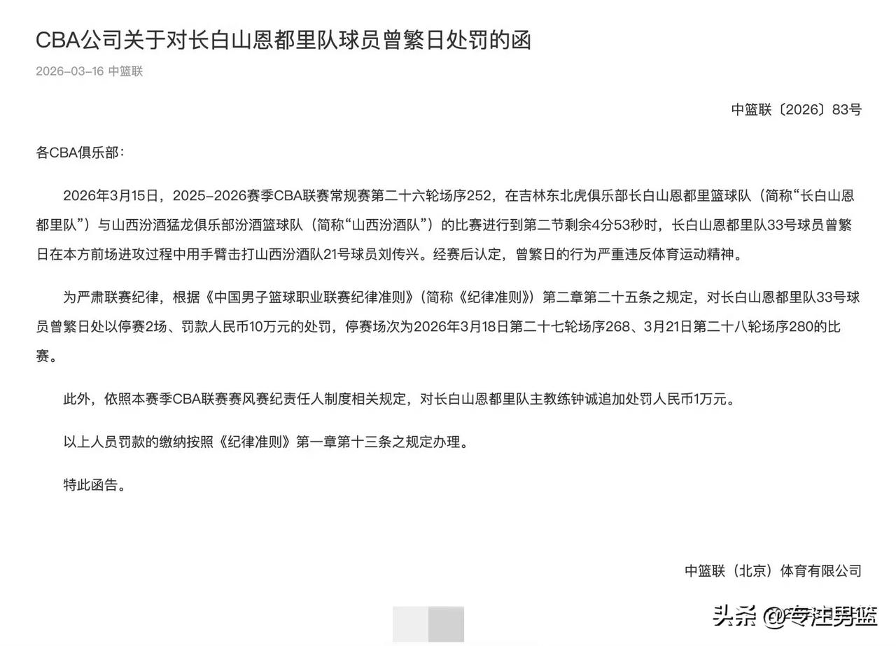 CBA处罚通知: 阿日被停赛2场,罚款10W。 ---------------------- 阿日随手一掏,10W就没了。可能还要接受队内处罚,为冲动买单,得不偿失。 幸好刘传兴没事,这可不是小事,关系到传宗接代的事,有点闪失的话,大刘会恨阿日一辈子的! CBA球员的手部动作太多了,都是裁判惯出来的毛病。中国男篮在FIBA的比赛中被吹罚最多的就是手部犯规。