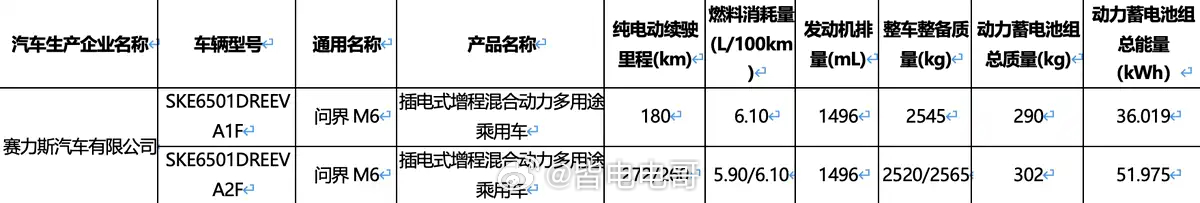 在最新一期的《减免车辆购置税的新能源汽车目录》可以看到问界M6的续航信息