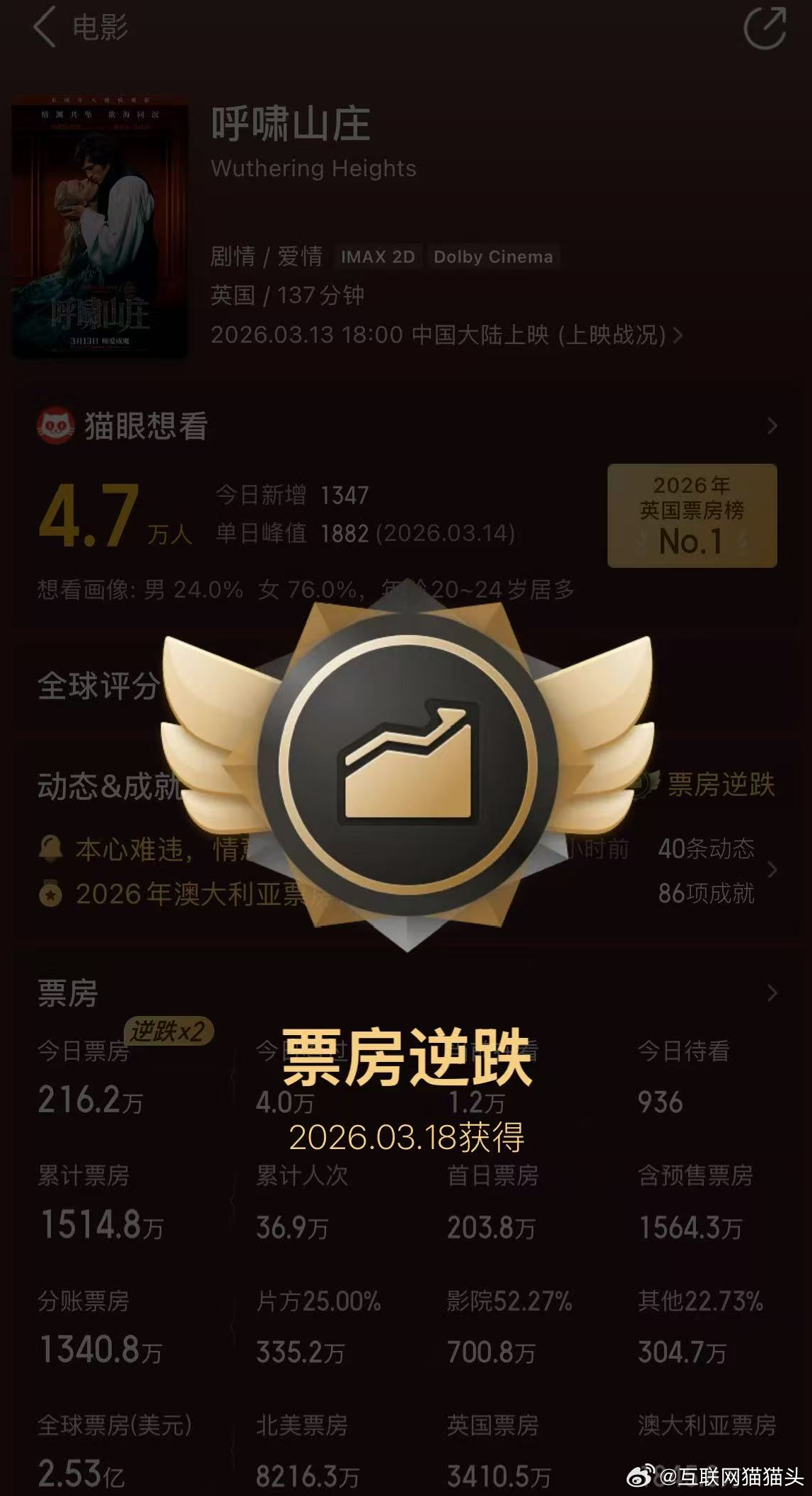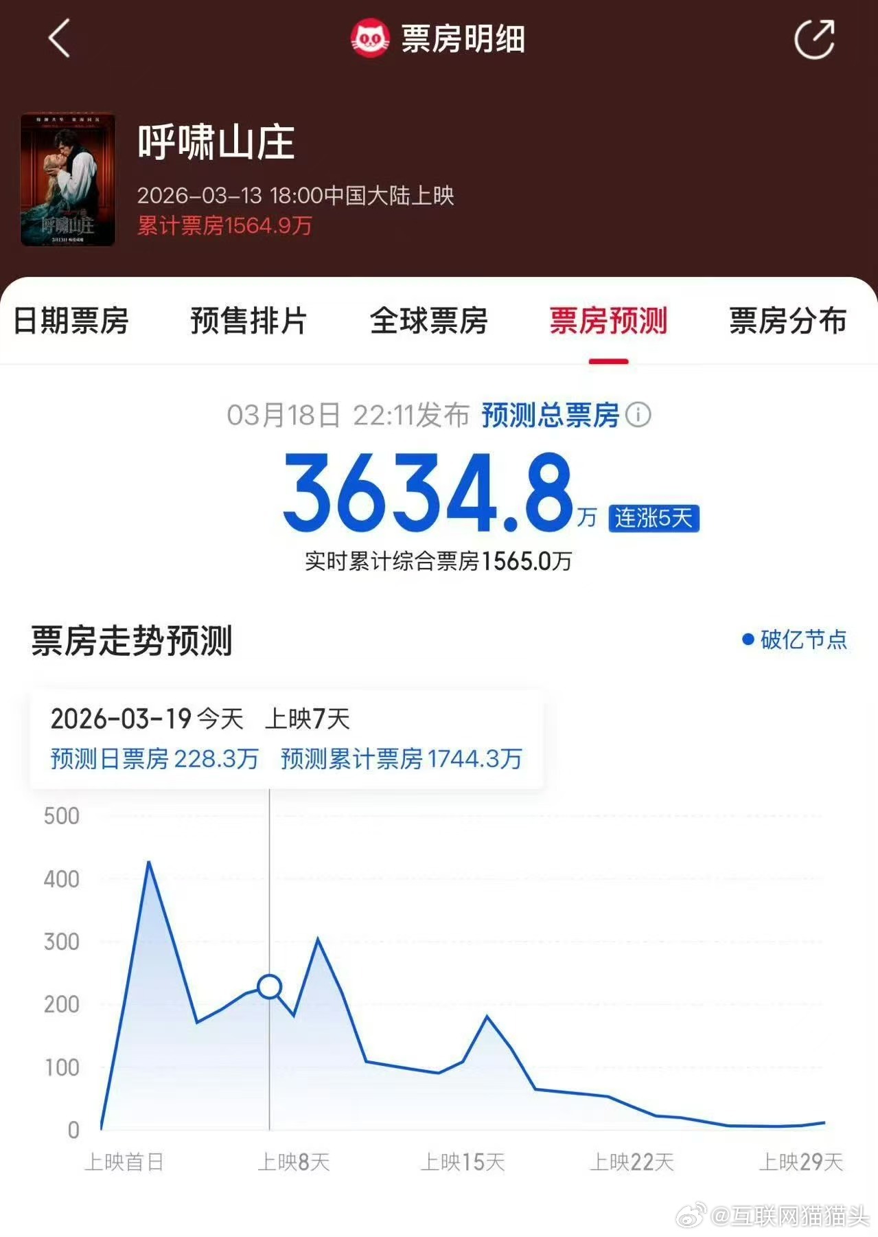 呼啸山庄预测票房连续5天上涨有人说《呼啸山庄》是电影香菜,喜欢的人会特别爱,我直接看哭了😭 抛开剧情,这部电影的视听氛围也值得去电影院沉浸式感受!票房都连续上涨逆跌了,能不能多给点排片啊!呼啸山庄票房逆跌
