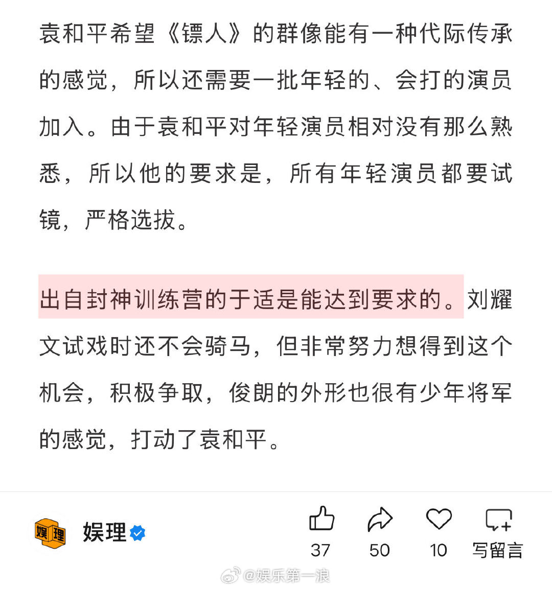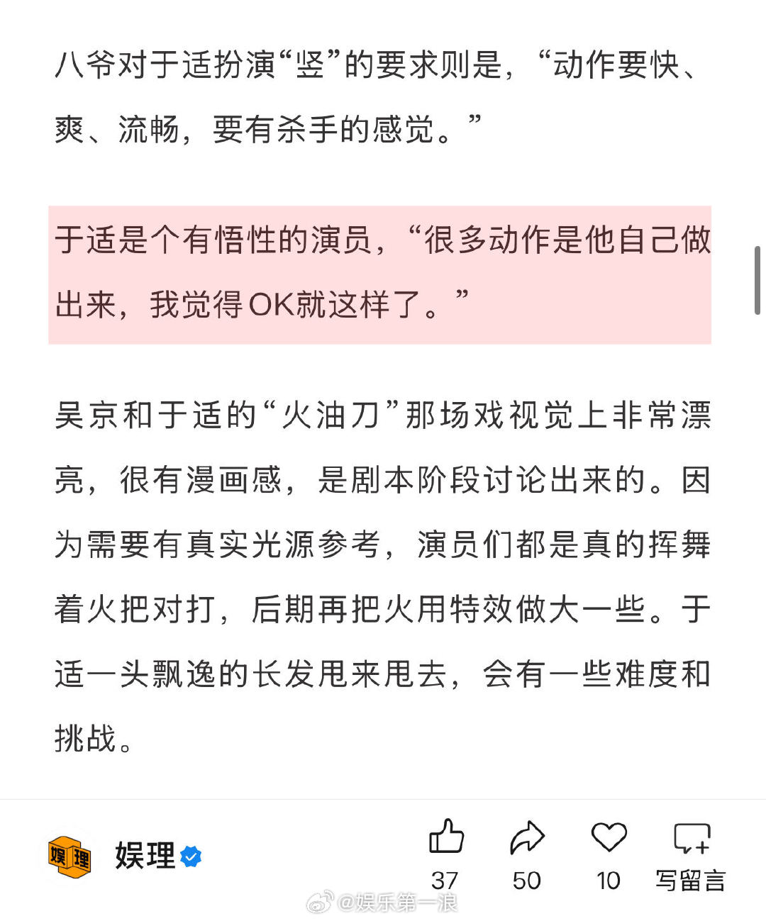 袁和平说镖人续集还可以拍 袁和平谈没让于适露胸肌 《镖人》上映之后,有不少网友还注意到了于适的胸肌,袁和平笑说其实拍的时候他们也注意到了。“因为他跳进了河里,我们也在探讨要不要(再露出一点),后来觉得那样就刻意了,算了,这样就可以了。” “火油刀对打”是剧本阶段讨论出来的,于适一头飘逸的长发甩来甩去,会有一些难度和挑战。 娱理独家↓