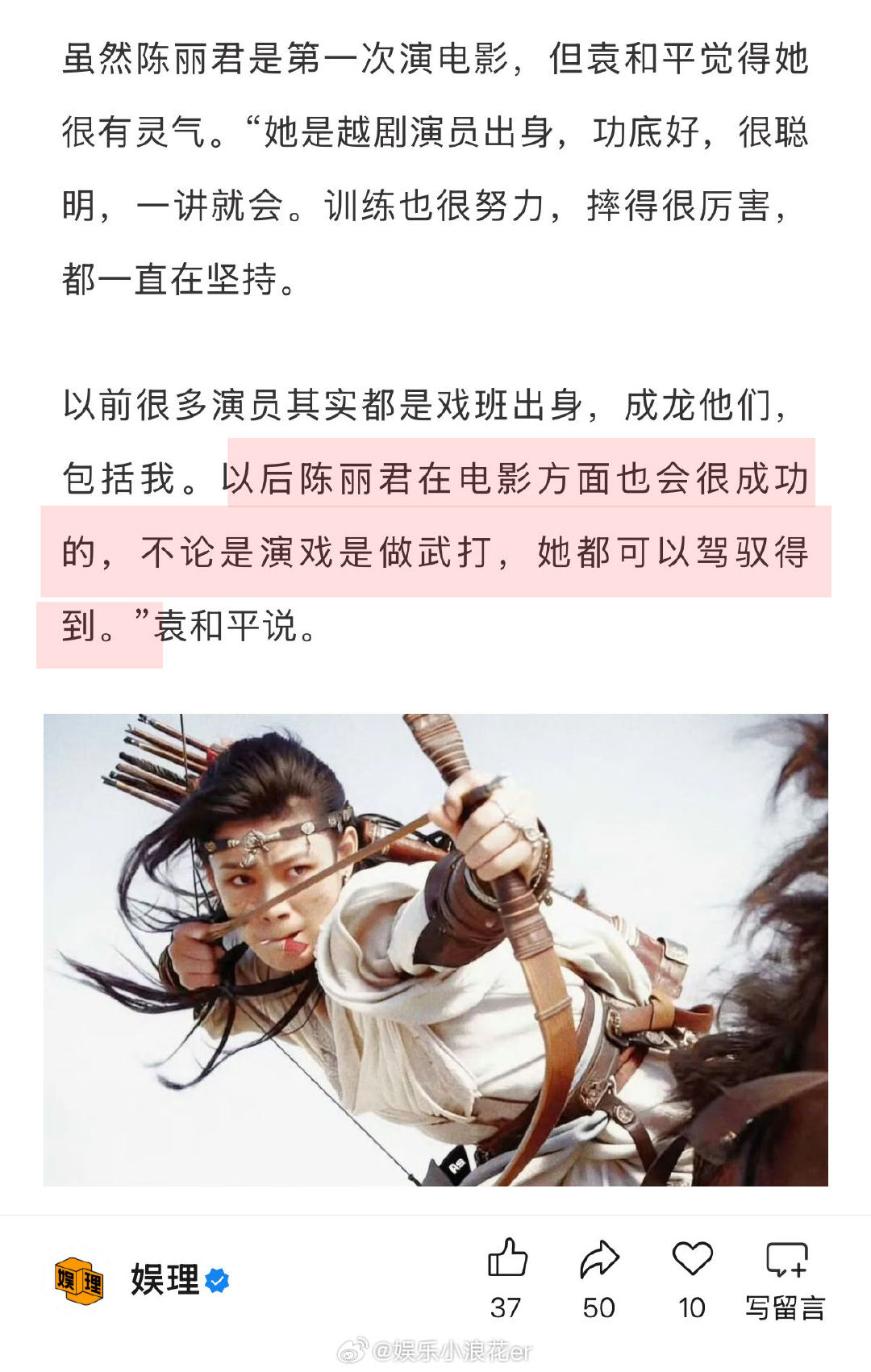 袁和平觉得陈丽君很有灵气 袁和平说镖人续集还可以拍 《镖人》是陈丽君是第一次演电影,但袁和平觉得她很有灵气。“她是越剧演员出身,功底好,很聪明,一讲就会。训练也很努力,摔得很厉害,都一直在坚持。以前很多演员其实都是戏班出身,成龙他们,包括我。以后陈丽君在电影方面也会很成功的,不论是演戏是做武打,她都可以驾驭得到。” 娱理独家↓