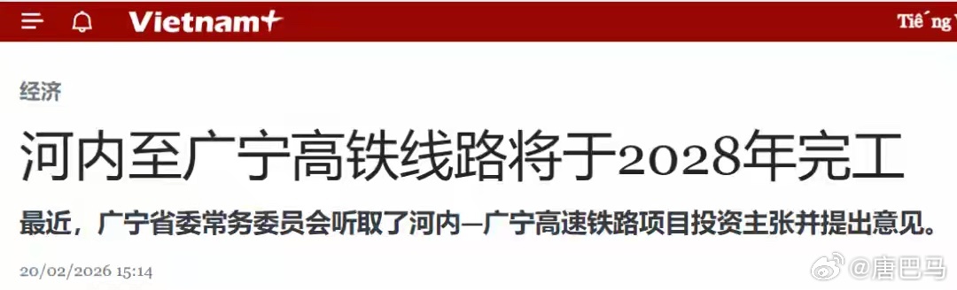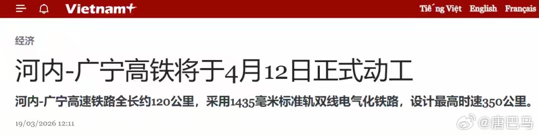 最新消息:河内至广宁高铁刚提出来没多久,但“进度”超乎预期:项目计划在2026年4月12日正式动工!从目前公开的信息来看,项目计划工期仅为24个月,竟然计划在2028年完工!通往中国广西东兴方向的河内至广宁高铁,该高铁未来可衔接海防-广宁-芒街铁路直通中越边境,甚至可以通过互联互通衔接中国境内的防城港至东兴铁路。值得期待!