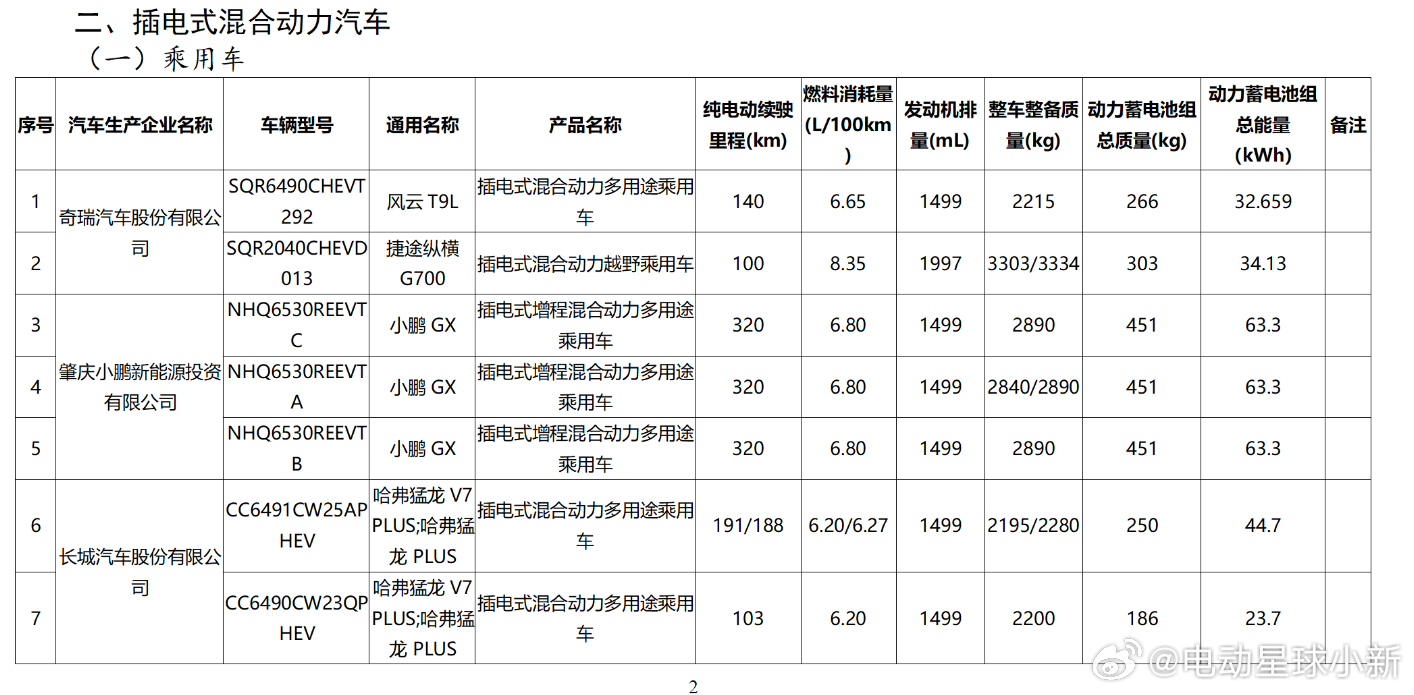 ⭐小鹏 GX- 91.9 kWh 版本,整备质量 2690/2750kg,纯电续航为 665/635km;- 110 kWh 版本,整备质量 2785/2820kg,纯电续航为 750/720km;- 63.3 kWh 版本,整备质量 2840/2890kg,纯电续航为 320km;(插混)