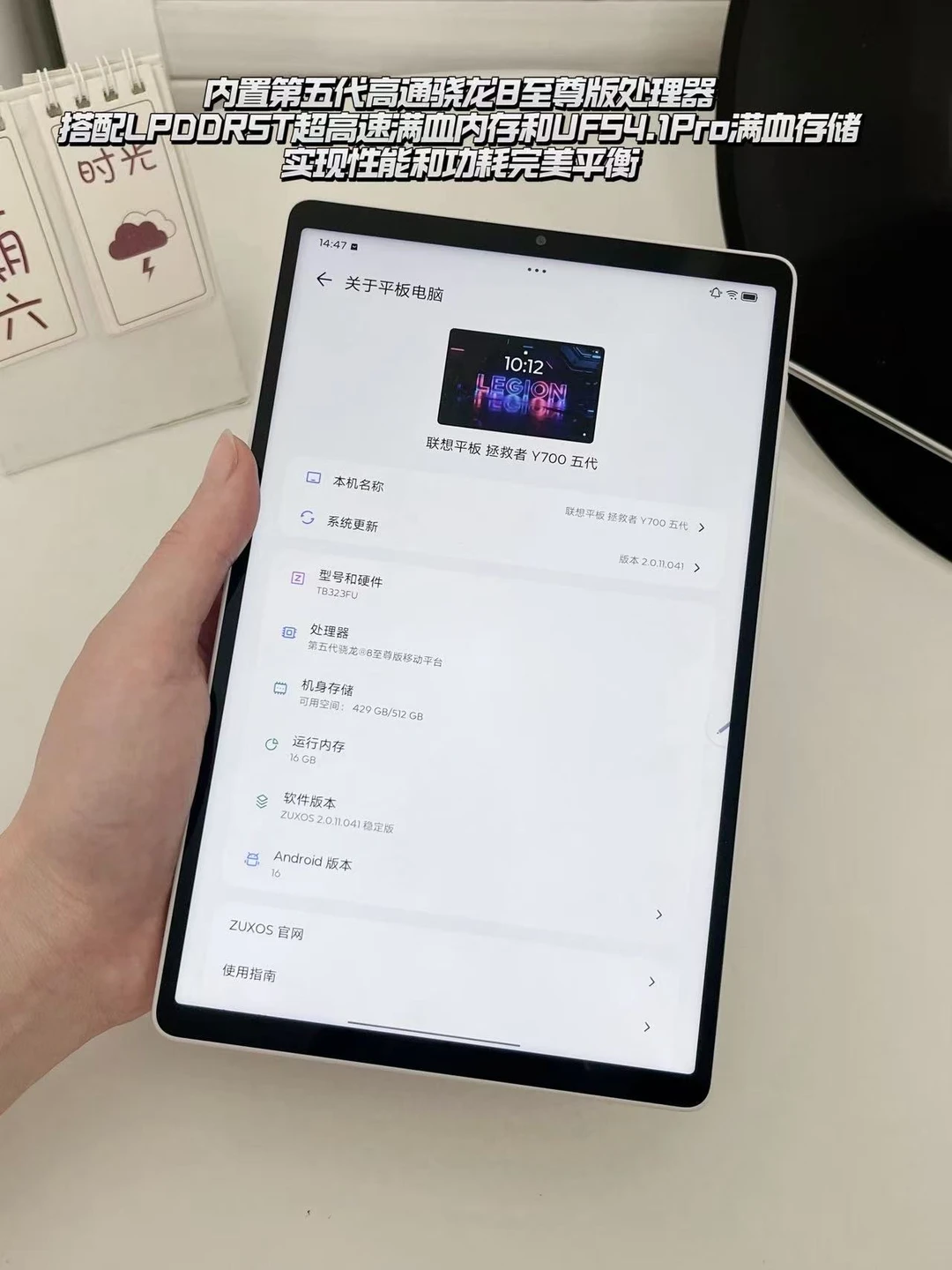 作为一名数码爱好者,更是实打实的性能追求者,选电竞平板首先看性能配置,看到联想AI平板拯救者Y700新品的配置后直接被惊艳,跑分和硬件都没得挑,完全符合性能追求者的期待! - 性能配置又上了一个台阶,整机性能无短板。内置第五代高通骁龙8至尊版处理器,算力和能效双双拉满;搭配LPDDR5T超高速满血内存,后台常驻很多应用也丝滑不卡顿,切换响应特别快;再加上UFS4.1Pro满血存储,读写速度再升级,硬核性能铁三角加持,重载场景稳稳拿捏不翻车。拿下安兔兔跑分453万分的亮眼成绩,运行大型手游、3A游戏模拟器都能保持流畅,毫无压力。对比上一代处理器功耗降低16%,实现性能和功耗完美平衡,对性能追求者来说太难得了! - 散热系统升级也为性能释放保驾护航,平板性能再强散热跟不上也会降频卡顿,乾坤散热3.0直接解决这个问题。17353平方毫米真空腔均热板+VC液冷散热,大幅提升散热面积和效率,优化主板电池布局让SOC位置居中,避免手握区发热,长时间玩大型游戏也能保证处理器满负荷输出,性能全程不缩水! - 除了核心性能,屏幕和操控硬件配置也毫不逊色。8.8英寸屏幕搭载3K超清分辨率,408PPI画面细腻,165Hz高刷新率搭配480Hz触控采样率、2640Hz瞬时采样率,已经是拯救者史上最高瞬时采样率,触控响应速度和跟手度能保证指尖操作及时反馈,操作体验丝滑流畅。屏幕支持HDR10和杜比视界,色彩表现出色,多重莱茵护眼认证让长时间使用更舒适,硬件配置发展均衡! - 9000mAh大电池搭配68W满血快充,续航充电同档位上游,支持旁路充电和PD3.0、QC3.0快充协议兼容性好。双C双X轴线性马达、超线性双扬声器带来沉浸体验,TF卡槽支持最高2TB扩展满足海量存储需求。超级互联3.0新增IOS设备互联,跨生态协同更流畅,文件秒传通信共享。还有丰富生态周边,专属游戏手柄和街机底座能极致发挥性能,辐射更多使用场景! - 这款拯救者Y700新品从核心性能到细节配置都做得很到位,完全满足性能追求者期待,值得入手!