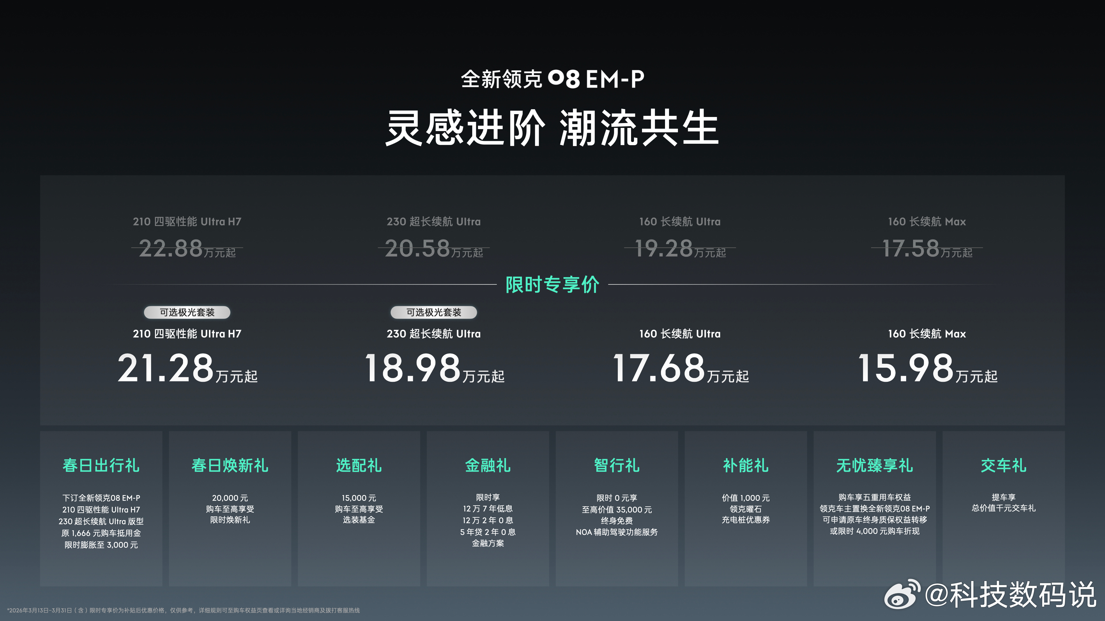 领克08极光套装灵感上新全新领克08 EM-P极光套装以极光银外观+曙光橙内饰的专属撞色方案为核心,辅以流光天际侧窗饰条、全车流光镀铬饰件及全新20英寸流光轮毂设计,相比此前的变化还是挺大的,车型方面,极光套装适配“230超长续航Ultra版型”与“210四驱性能Ultra H7版型”。作为20万级智能SUV,全新领克08 EM-P预计将在第二季度推送LYNK Flyme Auto 2.2.0智能座舱系统,千里浩瀚H7安全辅助驾驶将解锁D2D车位到车位领航驾驶辅助。千里浩瀚G-ASD作为吉利统一的智驾技术路线,拥有行业第一的云端算力,可针对不同定位车型,实现算力与感知的定制化精准适配,全新领克08 EM-P搭载以后,将极大提升智能辅助驾驶使用体验,对于日常不同场景下的驾驶需求也能有更舒心的用车体验,此举能够满足用户的进阶需求,更新非常重磅,也非常实用,可以期待一波 而且限时价15.98万元起,现在还有七年低息,首付至低3.98万,日供只需要53元,很令人心动~ 现在买极光套装还送IP ROBBi 联名礼盒~