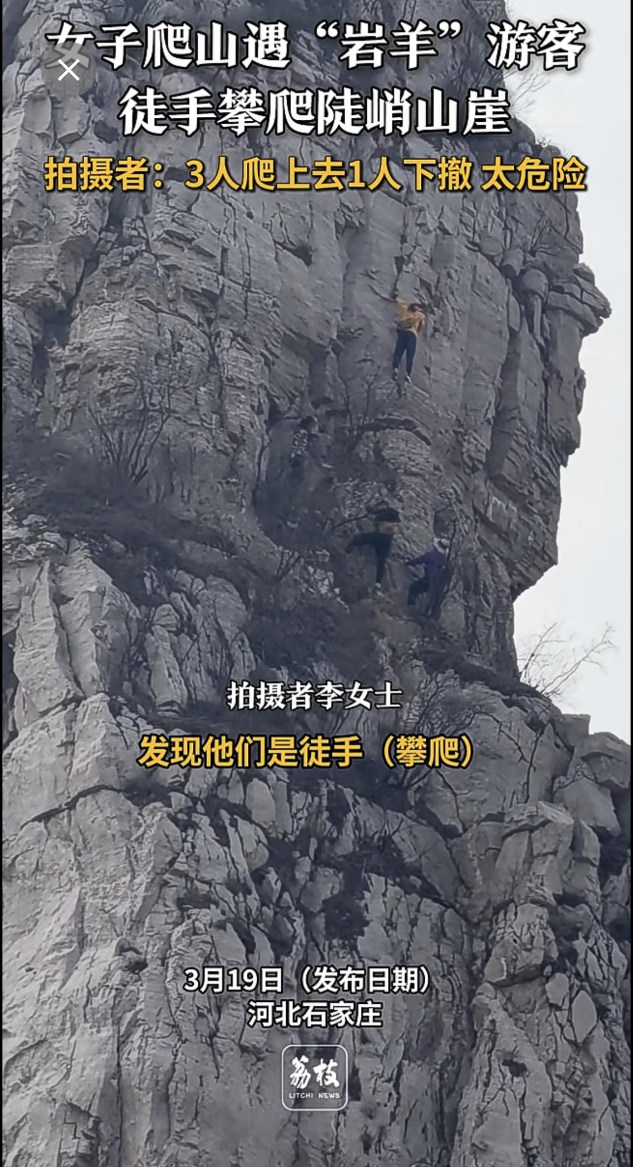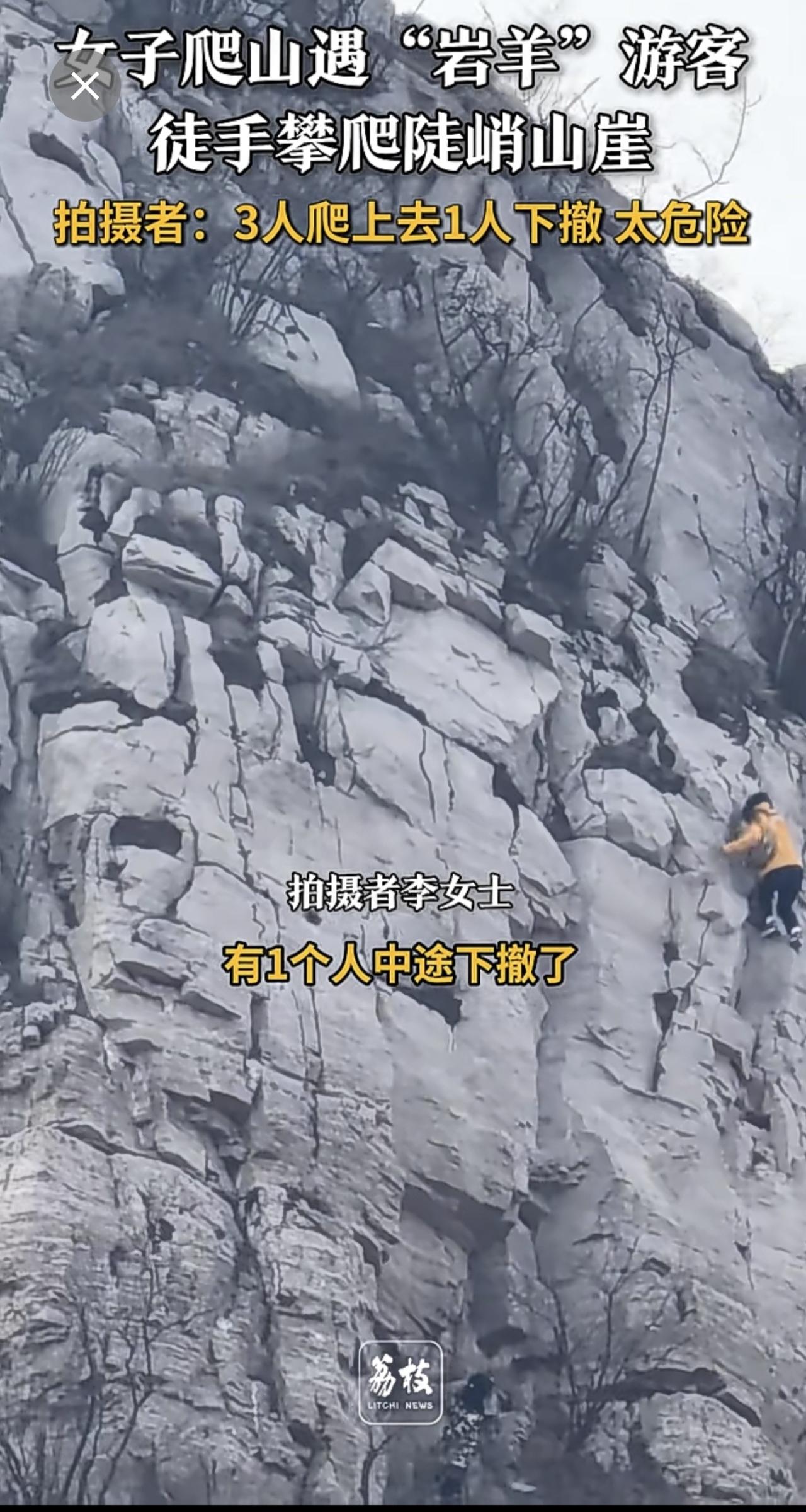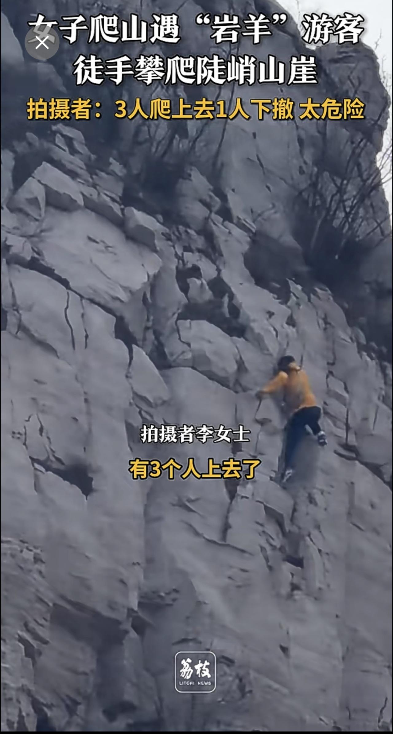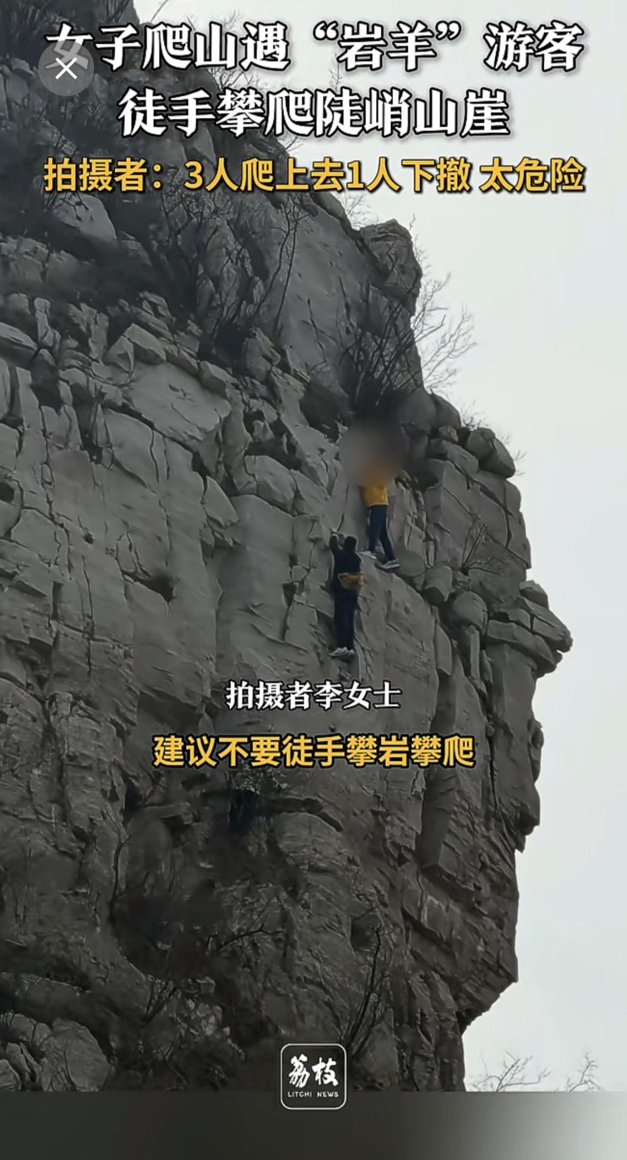 4人徒手攀爬几乎垂直山崖 游客回应4人徒手攀爬垂直山崖 :3人爬上去1人下