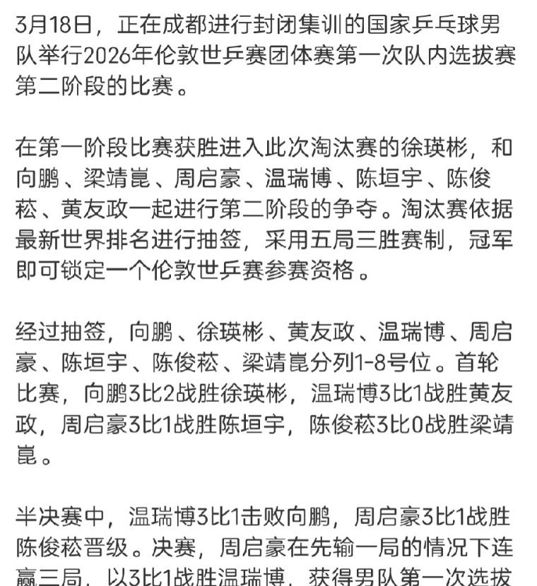 选拔赛结束,梁靖崑恐彻底无缘世乒赛!仅剩一个机会! 3月18日,国乒男队举行了伦