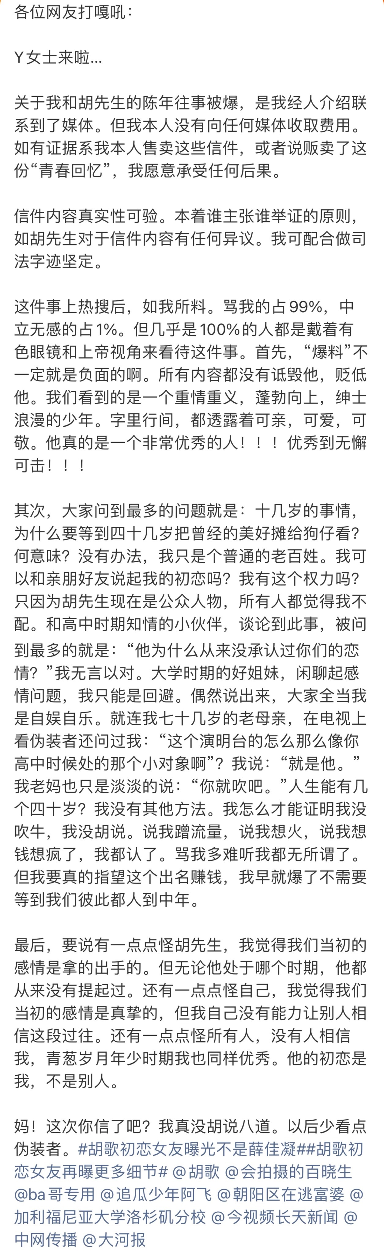 胡歌初恋女友发文,说这些年她向姐妹、母亲提起自己的初恋是胡歌,却一直不被相信,所以才出来爆料。她还埋怨胡歌为何从未公开提过这段感情。