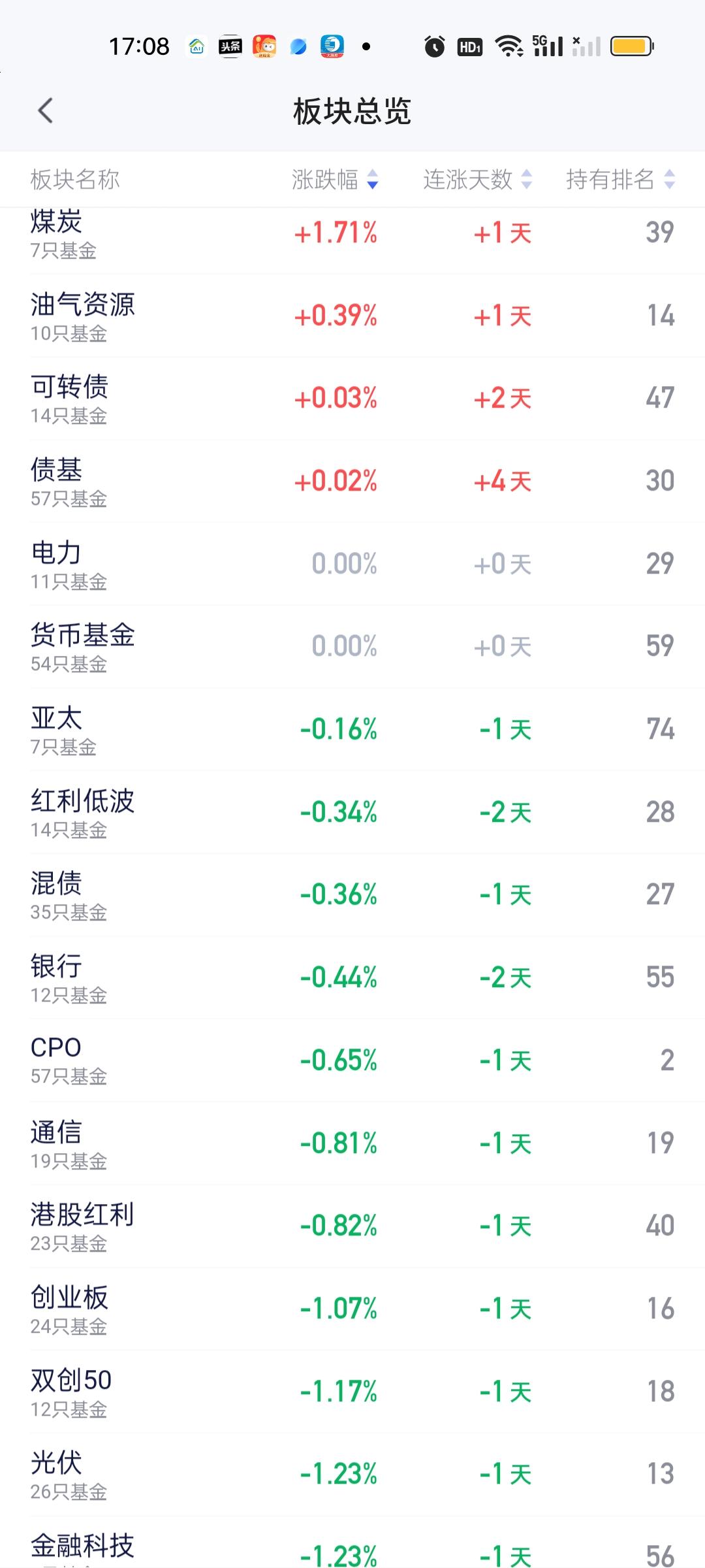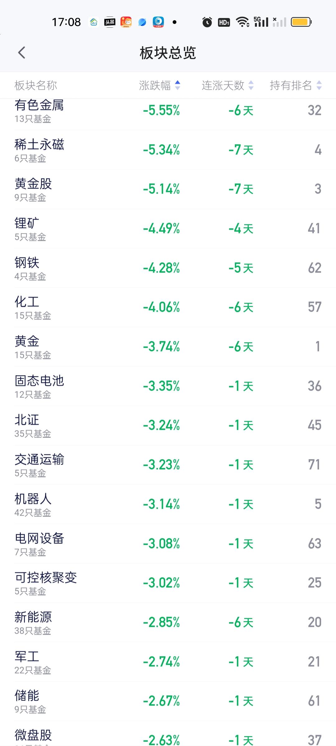 今天收红的板块非常少,满打满算只有煤炭,油气资源和债基。下跌的板块非常多。不仅数量多而且跌幅还大。有色金属,稀土永磁和黄金跌幅都在5%以上,锂矿,钢铁,化工跌幅在4%以上。固态电池,北证,交通运输,机器人,电网设备,可控核聚变跌幅都在3%以上。跌幅在2%以上的板块也不在少数。