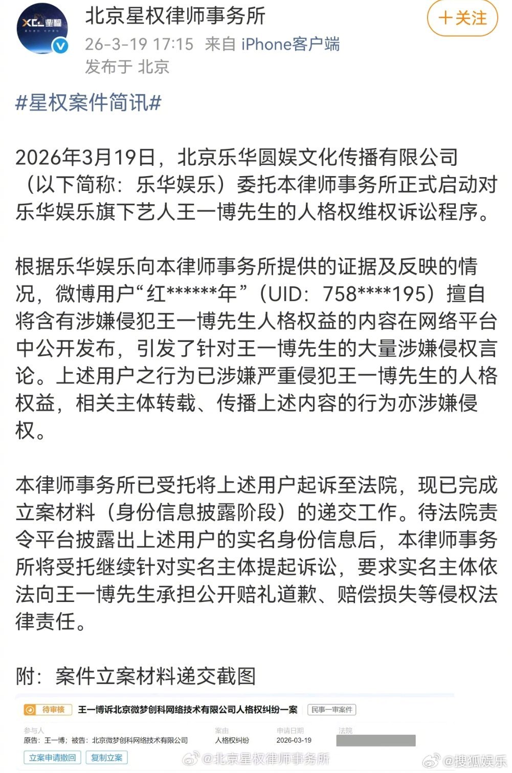 据,乐华娱乐已起诉微博用户“红******年”(UID:758****195),称其擅自将含有涉嫌侵犯王一博先生人格权益的内容在网络平台中公开发布,引发了针对王一博先生的大量涉嫌侵权言论。该用户之行为已涉嫌严重侵犯王一博先生的人格权益,相关主体转载、传播上述内容的行为亦涉嫌侵权。