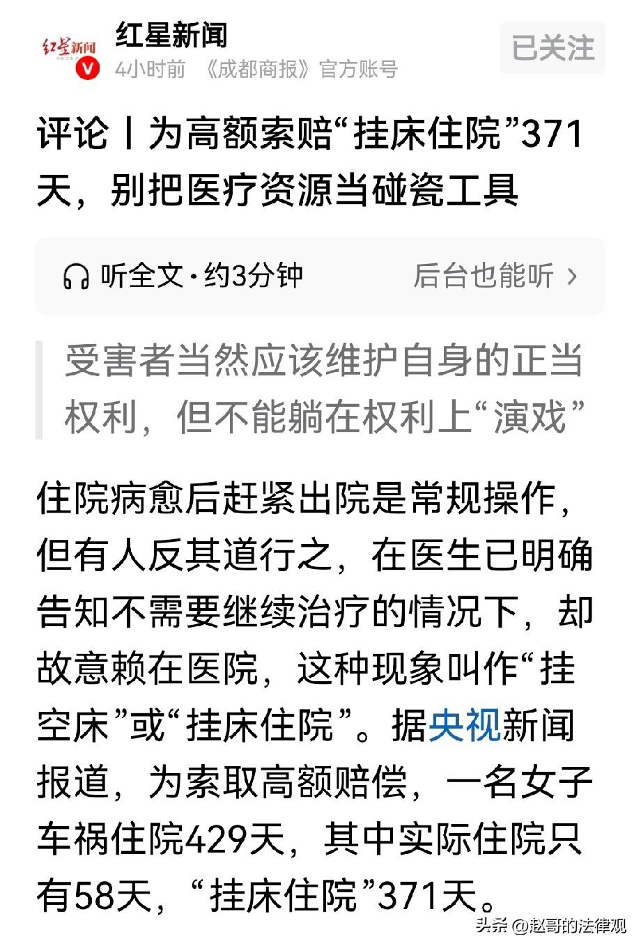 搬起石头砸自己的脚!湖北公安,女子过马路不走人行横道,被一辆轿车撞倒,头部受伤,司机被认定为主责,女子被认定为次责,送医后,住院期间的费用由保险公司、司机一块承担。没想到,本应住院58天,女子住了一下住了429天,其中挂床371天。出院后,女子向司机和保险公司索赔30万元,法院判决,令女子后悔莫及。 赵某过马路时抄近道,司机李某没刹住车,将她撞倒在地。 赵某头部受了伤,被及时送进医院,李某也认栽,想着有保险公司,该赔多少赔多少。 报警后,交警来了一看,李某没注意驾驶安全是主责,赵某没走人行横道是次责。 双方分工明确,赔偿流程也该顺理成章。 赵某住院后,李某和保险公司没含糊,医药费该垫付垫付,就盼着她早日康复出院。 可赵某这院住得心安理得,比上班的护士都稳当。 医生查房时告诉她,伤情早就稳定了,该做的治疗都做了,可以出院回家了。 可她照样雷打不动地占着那个床位。 保险公司去医院一看,赵某根本就没在医院,一打听他只是偶尔来病房打个照面。 可床位费、护理费、各种杂费还得照样拿。 赵某这一住,就是429天,主要的是她平时不在医院呆着。 但又不办住院手续,这就是医生口中的挂床。 原本几万块钱能解决的事,最后赵某拖出一张30多万元的天价账单。 整整429天,赵某终于肯出院了。 出院后,他拿着账单找保险公司去报销。 保险公司早调查的一清二楚,明确的告诉他只按58天的住院时间计算费用来理赔。 赵某一下子傻了眼,30万可不是小数目,他自己根本拿不出这些钱来。 多次协商保险公司一口咬定,多一分不赔。 赵某又找到司机李某,她的理由是:罪受了了,这一年多没工作,得赔误工费。 护理费、营养费、伙食费,一笔笔算下来,总共要30多万。 李某看到这数额当时就蒙了,这哪是住院啊,这简直是在医院打卡“上班”! 双方也谈不拢,只能法庭上见。 法官为了调查,这给律师开了调查令,直接去医院调取了赵某的全部行为。 她每天的体温单、用药记录、长期和临时的医嘱,甚至连护士每次查房留下的记录都没放过。 这一查,真相彻底藏不住了。 厚厚一沓病程记录摊在桌上,法官一页一页对。 结果发现,虽然名义上住了400多天。 但赵某真正接受治疗、有给药记录、有体温监测的日子,满打满算只有58天。 剩下的371天里,病历本上几乎是空白的。 没有药,没有针,没有检查,只有那个床位费在每天雷打不动地跳数字。 这就是典型的“挂空床”。 赵某打着如意算盘:反正有保险公司买单,只要我不出院,误工费就能一直算下去,护理费也能一直领。 她觉得住得越久,赔得越多,把病房当成了变现的提款机。 可她忘了,法律讲的是合理支出,不是谁赖得久谁就有理。 法庭上,法官的话说得很硬气。 虽然法律规定,侵害他人要赔偿医疗、误工、护理等费用。 但前提必须是,治疗和康复支出的合理费用。 371天里啥病也没治,纯粹是为了磨时间拿赔偿,这钱谁都不能出。 最终,法院只认定了58天的合理住院期。 至于剩下那一年多产生的两万多块钱“挂床费”,赵某得自己掏腰包。 最终,法院判决,支持了19万余元的合理赔偿,其他全部被驳回。 赵某本以为考这次住院多捞一笔。 结果,不但没拿到那30万,还得自己承担一年多不合理的开销。 《民法典》第一千一百七十九条:侵害他人造成人身损害的,应当赔偿医疗费、护理费、交通费、营养费、住院伙食补助费等为治疗和康复支出的合理费用,以及因误工减少的收入。 也就是说,这是为了保护受害人的合法权益,让受到人身伤害的人能得到合理赔偿。 赵某因交通事故受伤,有权要求司机,和保险公司赔偿相关费用。 可她为获取更多赔偿,挂床371天,这期间未进行实际治疗。 产生的费用,不属于为治疗和康复,支出的合理费用。 法院只认定了58天的合理住院期费用,体现了法律维护公平正义。 保障赔偿合理合法,不会让当事人,通过不正当手段获取额外利益。 有人说,58天根本治不好,伤筋动骨一百天,就是小伤也得三个月以上。 被车撞了,一年的治疗也无可厚非,还有康复期,疗养期,就是不用药了也得以慢慢恢复。 所以说,交通事故不是住院58天就完事的。 其实,赵某最终拿了19万赔偿,应该算上了后期的康复费。 医疗资源应该留给真正需要救助的人,不是某些人钻空子、发不义之财的旅馆。 对此你怎么看