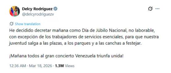 3:2赢美国,委内瑞拉举国沸腾,代总统当即宣布:全国放假一天! 委内瑞拉棒球国家队在美国迈阿密以3比2击败美国队,夺得世界棒球经典赛冠军。这不仅是该国历史上的首个冠军头衔,也在国内迅速引发了广泛的社会反响与情绪共振。代总统德尔西·罗德里格斯随即宣布,将周三设立为“全国非工作欢庆日”,以纪念这一历史性时刻。 可能很多人没概念,这场胜利对委内瑞拉来说,根本不只是一场体育比赛的输赢。委内瑞拉这些年日子过得不算容易,国内有经济困境,还面临外部压力,民众心里长期憋着一股劲没处释放。 棒球在委内瑞拉是真正的国球,普及度比咱们的乒乓球还高,几乎家家户户都能聊上几句棒球,不少孩子从小就抱着棒球棍长大。这支国家队里,没有多少身价上亿的超级球星,赛前外界普遍不看好他们能赢。 美国队不一样,他们云集了多名美国职业棒球大联盟的球星,赛前就被认定是夺冠大热门。更关键的是,这场决赛在美国迈阿密举办,相当于美国队的主场,现场大部分观众都是美国球迷,委内瑞拉队从一开始就处在客场劣势。 比赛过程看得人手心冒汗。委内瑞拉队先声夺人,第三局就率先拿下一分,第五局又凭借一记本垒打把比分扩大到2比0。就在大家以为他们能稳稳赢下比赛时,美国队在第八局发力,靠着球星哈珀的一记两分本垒打,把比分扳成了2比2平。 关键时刻委内瑞拉队没慌,第九局上半,苏亚雷斯打出一记关键安打,帮助球队重新取得领先,把比分定格在3比2。最后投手帕伦西亚登场,干净利落地完成三振,彻底锁定胜局。 终场哨响的那一刻,迈阿密的球场里,委内瑞拉球员直接身披国旗跪地痛哭。现场两万多名委内瑞拉侨胞瞬间沸腾,他们的欢呼声直接盖过了美国球迷的助威声,不少人举着国旗又唱又跳,场面特别震撼。 消息传回委内瑞拉国内,整个国家瞬间陷入狂欢。首都加拉加斯的多个广场,挤满了观看直播的民众,欢呼声、口哨声、汽车鸣笛声交织在一起,连空气里都飘着激动的气息。 有人举着球队的海报,有人挥舞着国旗,还有人自发组织巡游,大家互相拥抱、欢呼,不少人激动得落泪。这些年委内瑞拉民众过得不容易,通胀严重,不少人的月收入很低,生活压力很大,这场胜利给了他们难得的快乐和希望。 代总统德尔西·罗德里格斯第一时间在社交媒体上发文,她盛赞国家队的拼搏精神,说这场胜利是整个委内瑞拉的荣耀,是全体民众的骄傲。紧接着她就宣布,将周三定为“全国非工作欢庆日”,除了必要的服务人员,全国停班停课,让大家能尽情庆祝这份胜利。 更难得的是,这场胜利让委内瑞拉国内原本分歧严重的各个阵营,暂时放下了矛盾。连一直和执政党不对付的在野党领袖,也公开发文祝贺,说身为委内瑞拉人,她为这支球队感到无比自豪。 大家可能会问,为什么一场棒球比赛,能让一个国家这么疯狂?其实答案很简单,委内瑞拉太需要这样一场胜利了。这些年,这个国家面临太多困境,外部有压力,内部有分歧,民众心里积压了太多压抑和迷茫。 这支棒球国家队,用一场以弱胜强的胜利,打破了外界对委内瑞拉的偏见,也让全国民众重新找到了归属感和凝聚力。他们不是靠运气,是靠每一局的坚持,每一次的拼搏,硬生生在美国的主场,赢下了这场意义非凡的比赛。 这场胜利不能直接解决委内瑞拉的经济和政治问题,但它给了这个国家一剂强心针。它让民众看到,只要团结起来、坚持下去,就没有克服不了的困难。它也让世界看到,委内瑞拉人身上的坚韧和勇气。 全国放假一天,不只是对球队的奖励,更是对全体民众的慰藉。对委内瑞拉人来说,这一天的狂欢,是对过去困境的暂时告别,更是对未来的美好期盼。毕竟,能拥有这样一场让全国人共同欢呼的胜利,对此刻的他们来说,太珍贵了。