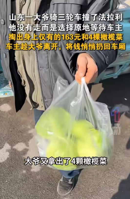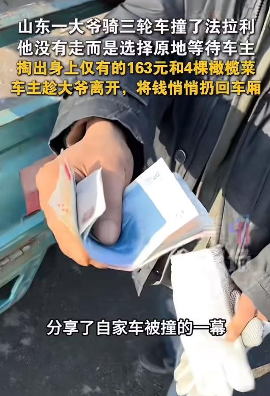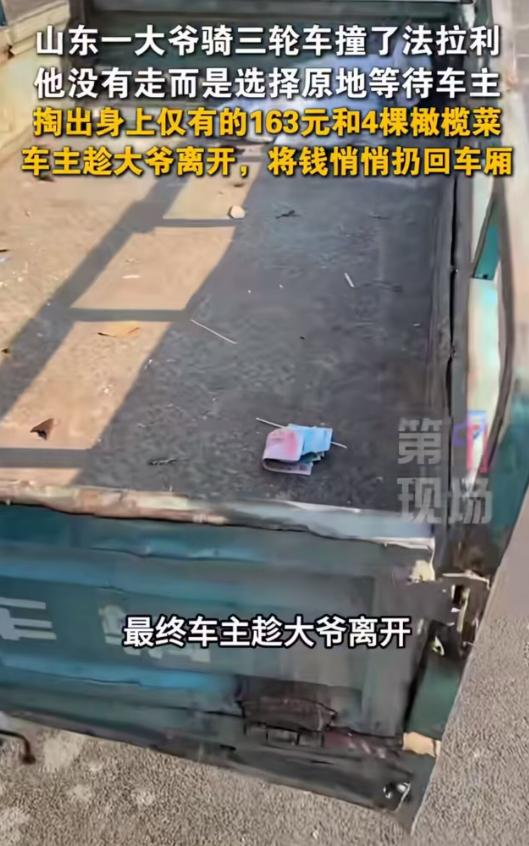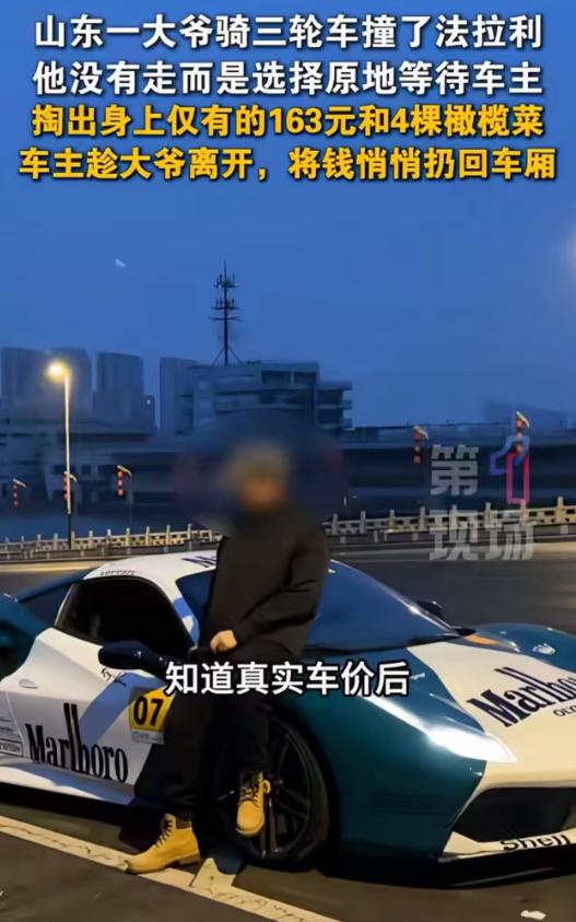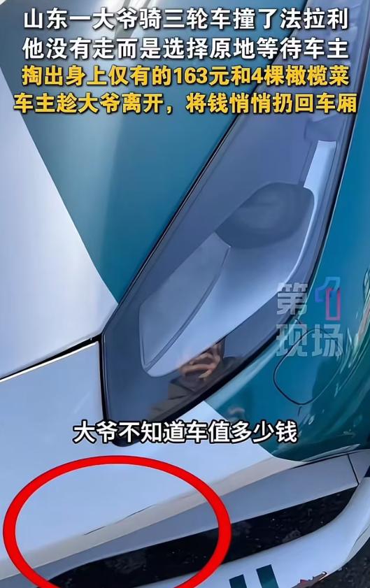 “这个法拉利车主火了”山东,大爷骑三轮车撞了法拉利,他没有跑而是选择原地等待车主。大爷掏出身上仅有的163元和4棵橄榄菜赔偿!车主愣了一下,跟大爷说了车子的价格,大爷惊呆了,随后一幕令人泪目! 沿街的摊贩正忙着售卖果蔬,叫卖的吆喝声、行车的叮铃声交织在一起,格外热闹。 忽然,一声突兀的“吱嘎”刹车声骤然响起,紧接着是轻微的“蹭擦”声。 围观的人很快围了过来,只见一辆车身斑驳的三轮车,车斗里放着半筐橄榄菜和一个褪色的竹篮。 而三轮车的车头微微倾斜,刚好蹭在了一辆法拉利的车头处。 那轿车格外惹眼,懂行的人一眼就认出,这是法拉利,动辄上百万的豪车,对寻常老百姓来说,简直是遥不可及的存在。 大爷慢慢挪下三轮车,脚步有些踉跄,随后他走到车头旁,缓缓蹲下身,用粗糙的手指,轻轻碰了碰蹭到的地方。 之后,大爷缓缓抬起头,看了看那辆耀眼的车。 大爷并不认识这是什么车,而且没有丝毫要偷跑的意思,他只是稳稳靠在自己的三轮车上,目光紧紧盯着法拉利的车门,等待着车主的到来。 过了一段时间后,车主走到自己车旁,目光一扫,就看到了车头的划痕,脸上掠过一丝心疼。 与此同时,大爷见车主来了,就急急忙忙迎了上去,脚步太急,还差点被路边的石子绊倒。 大爷的脸上写满了歉意,语气里满是慌乱和自责:“对不住,实在对不住,是我骑车太急,没注意看路,把你的车给蹭了。我一直在这儿等你,你看这事儿,该怎么赔,我就怎么赔,绝不推脱。” 说着,他就伸手往自己的口袋里摸索。 大爷掏出一个用手帕层层包好的小包,小心翼翼地打开一层又一层,里面全是皱巴巴的零钱,有一块、五块的,还有几张皱巴巴的十块和一张一百元。 他把这些钱轻轻放在手心,手指因为紧张而微微发抖,一张一张仔细数着,数了一遍又一遍,生怕数错一个子儿。 数完之后,他把钱双手递到小伙面前,声音低沉又愧疚:“孩子,这是我身上所有的钱了,一共163块,你先拿着,不够的话,我再想办法凑,我一定赔给你。” 小伙看着大爷手心里那堆皱巴巴的零钱,又看了看他那双布满老茧的手,最终对着大爷有些不忍心的说到:“嗯.....这车修一下要好多钱,这些......不够。” 大爷一听,心里更慌了,连忙转身跑到自己的三轮车旁,从车斗里捧出四棵带着新鲜的橄榄菜。 “我这还有这几棵菜,我把我所有的都给你,够不够?不够的话剩下的我回来再给你补!” 小伙接过大爷手里的橄榄菜和163块钱,愣了几秒,眼神里闪过一丝复杂的情绪。 最终小伙轻声说道:“不用啦,这些就够了!您的钱和菜我都收下了!” 不知道车价的大爷一个劲地对着小伙鞠躬,嘴里不停地念叨着:“谢谢你,太谢谢你了……” 小伙连忙扶住大爷,还笑着说道:“不用谢,您给够赔偿啦,您快回家吧,路上注意安全。” 大爷点了点头,用袖子擦了擦脸上的眼泪,又深深看了小伙一眼,才慢慢爬上三轮车,双手握住车把,骑着三轮车离开了。 而在大爷转身骑三轮车的时候,小伙儿趁机把大爷给他的163块钱,塞到了大爷的三轮车里! 小伙站在原地,看着大爷的身影渐渐远去,才转身离开了。 后来,这件事被发到了网上后,网友们纷纷在评论区留言。 有网友留言说:“为什么人家能开法拉利?这就是原因,富且仁,心善比钱多更难得,为车主点赞!” 还有网友感慨:“两个人用最朴素的举动,展现了最动人的温暖,这才是人与人之间该有的样子”。 也有网友说到:“对比那些撞了豪车就逃,甚至反过来道德绑架车主的人,大爷的担当太可贵了。” 还有网友留言道:“车主悄悄把钱放回去的操作太戳人了!既照顾了大爷的体面,又不用担心大爷不愿意收!” (信息来源:第一现场)