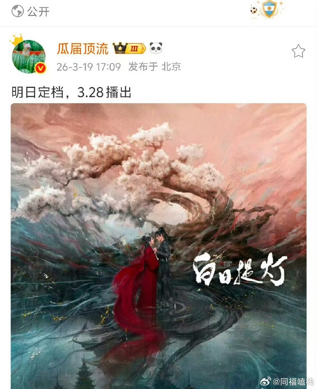 网传迪丽热巴、陈飞宇《白日提灯》明天定档,3月28日开播。 燥候贺思慕段胥!我已