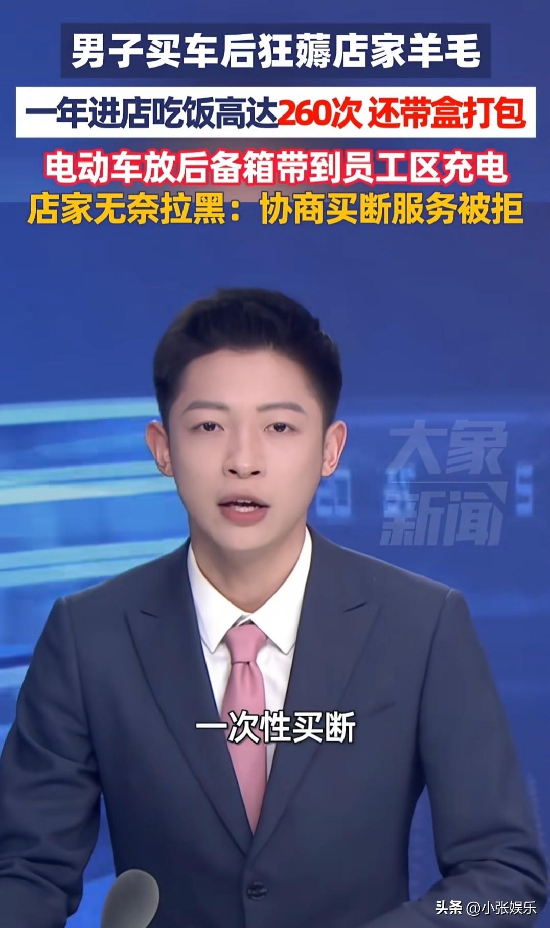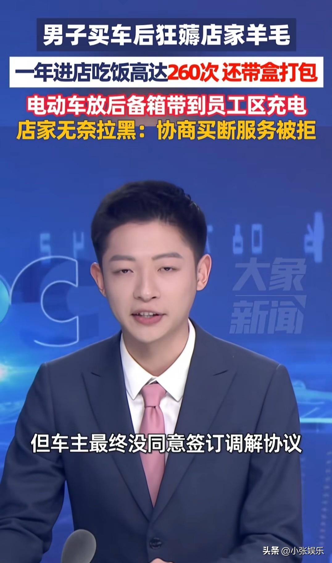 一年进店260次!买车后天天去4S店吃饭打包还充电,店家拉黑反被维权? 买车享免费服务,到底是“正当权益”还是“过度薅羊毛”? 浙江一位车主,买车后直接把4S店当成了自家食堂+免费充电站,一年进店高达260次,顿顿吃还顿顿打包,店家忍无可忍拉黑后,他居然要维权! 事情起因很简单: 男子在这家4S店购车时,销售明确承诺:免费洗车、免费充电、免费食堂就餐。 店家原本以为,车主顶多一个月来两三次,属于正常售后福利。 可谁也没想到,这位车主把“免费”用到了极致。 一年365天,他来了260多次! 每天雷打不动到店吃饭,不仅自己堂食,还自带饭盒疯狂打包。 更让店家崩溃的是,他还把电动车放进汽车后备箱,拉到4S店员工区域免费充电。 咱实话实说,这带电动车去充电这确实有点过分啊 从福利变成“常驻住户”,4S店彻底扛不住了。 成本天天增加,客流被占用,员工都看不下去。 多次沟通无效后,店家只能选择拉黑拒绝服务。 结果男子当场不干了,直接表示要维权! 4S店提出解决方案:一次性买断维修基金、保险券,彻底两清。 但男子拒绝签字调解,坚持要继续享受“当初承诺的免费服务”。 商家承诺的免费服务,属于售后赠与,并非无限制、无边界的长期消耗。 车主在合理范围内使用,是正当权益; 但超出常理、高频次、打包带走、额外占用公共资源,已经构成过度使用。 善意一旦被无底线透支,最后只会让所有车主失去原本的福利。 店家难,普通人生活也难,但边界感,才是成年人最大的体面。 免费不是无限,尊重才是长久。 别让你的“精打细算”,消耗掉别人原本的善意。