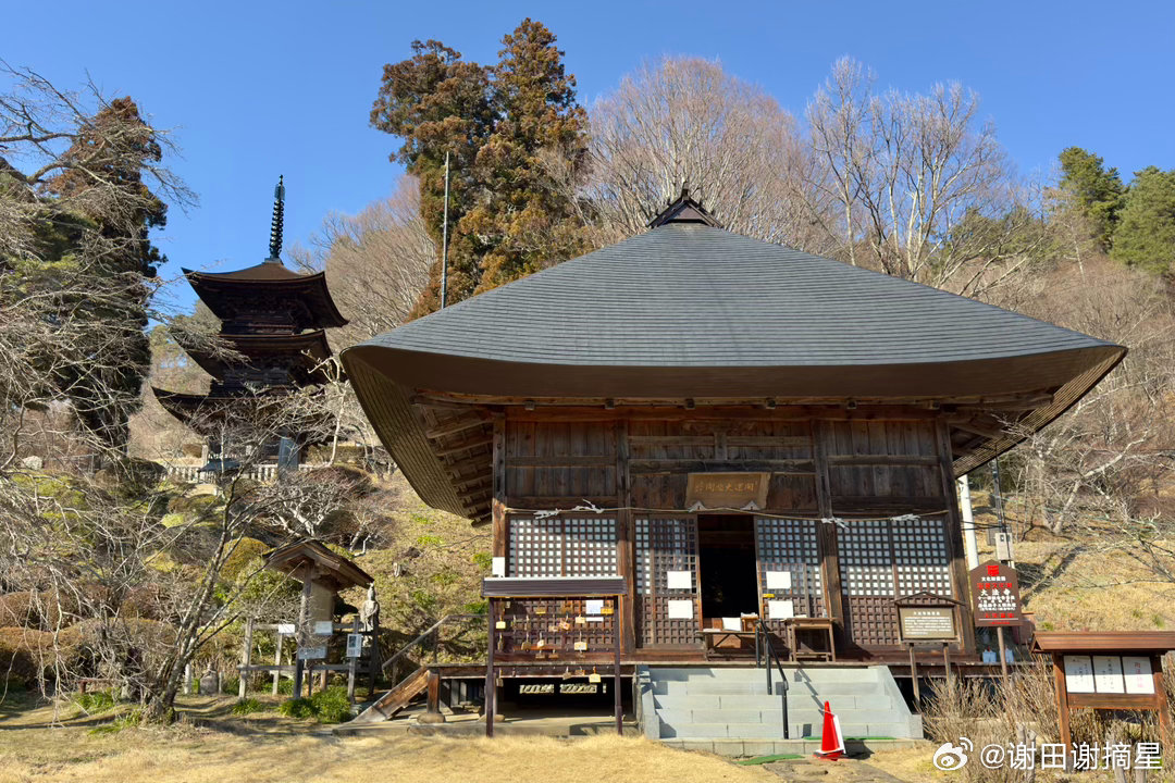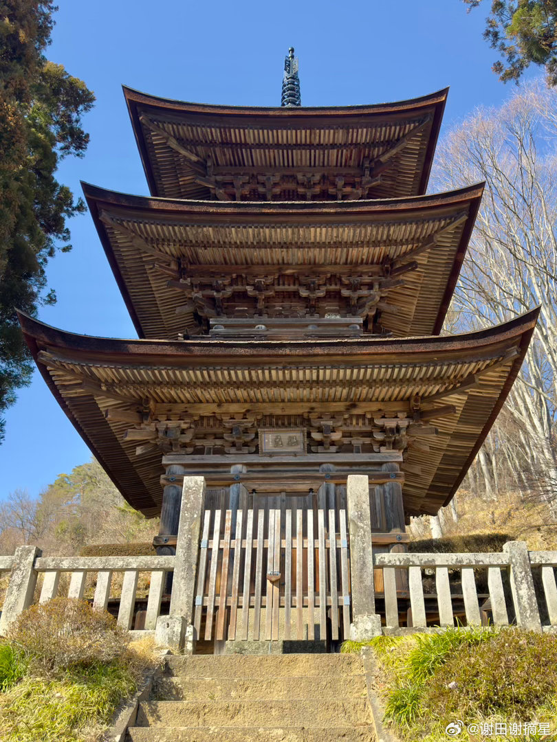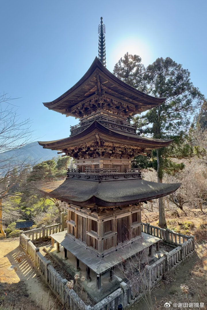 长野县一乘山大法寺的历史可以上溯到8世纪,现存的国宝三重塔建于1333年,也是镰仓时代的最后一年,塔名“惜别之塔”,恰好表达了对镰仓时代的追念。佛塔的大工是大阪天王寺的大巧四郎,风格是典型的关西唐风,一层檐比二层三层都大,显得十分稳重优雅。大法寺现在只有两个建筑,大殿里的厨子是室町时代的重要文化财,厨子里是平安时代的观音。