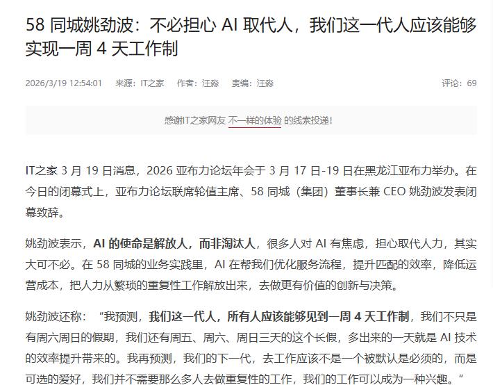 58同城姚劲波:AI是4天工作制的关键 据了解,在2026 亚布力论坛年会上,58 同城(集团)董事长兼 CEO 姚劲波谈到了“AI与生产力”这个话题。 他表示:“我预测,我们这一代人,所有人应该能够见到一周 4 天工作制,我们不只是有周六周日的假期,我们还有周五、周六、周日三天的这个长假,多出来的一天就是 AI 技术的效率提升带来的。我再预测,我们的下一代,去工作应该不是一个被默认是必须的,而是可选的爱好,我们并不需要那么多人去做重复性的工作,我们的工作可以成为一种兴趣。” 在他看来,即使很多人对AI有焦虑,担心对方抢夺自己的饭碗。但AI真正的使命仍然是解放人类,而非淘汰人类。