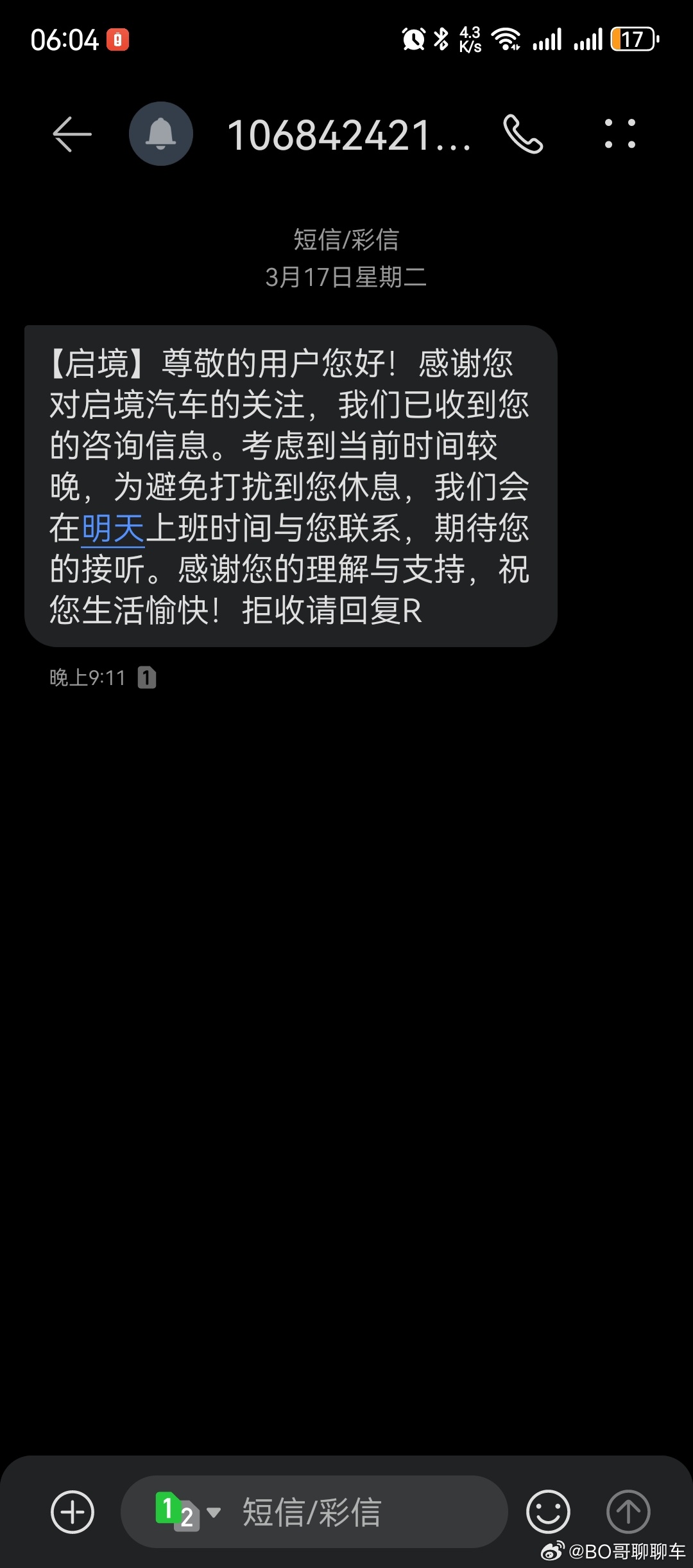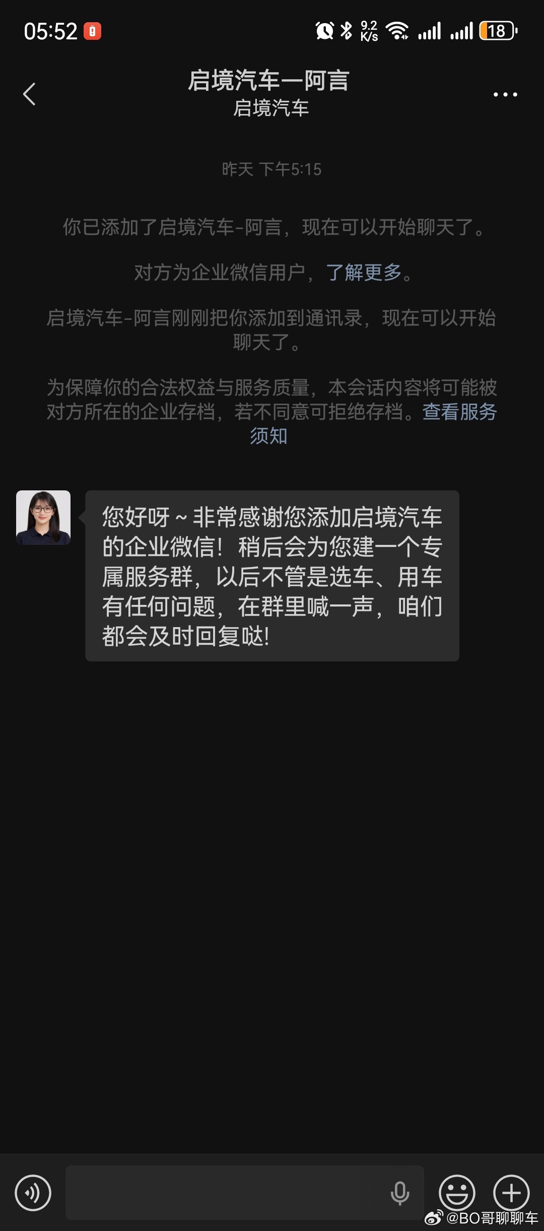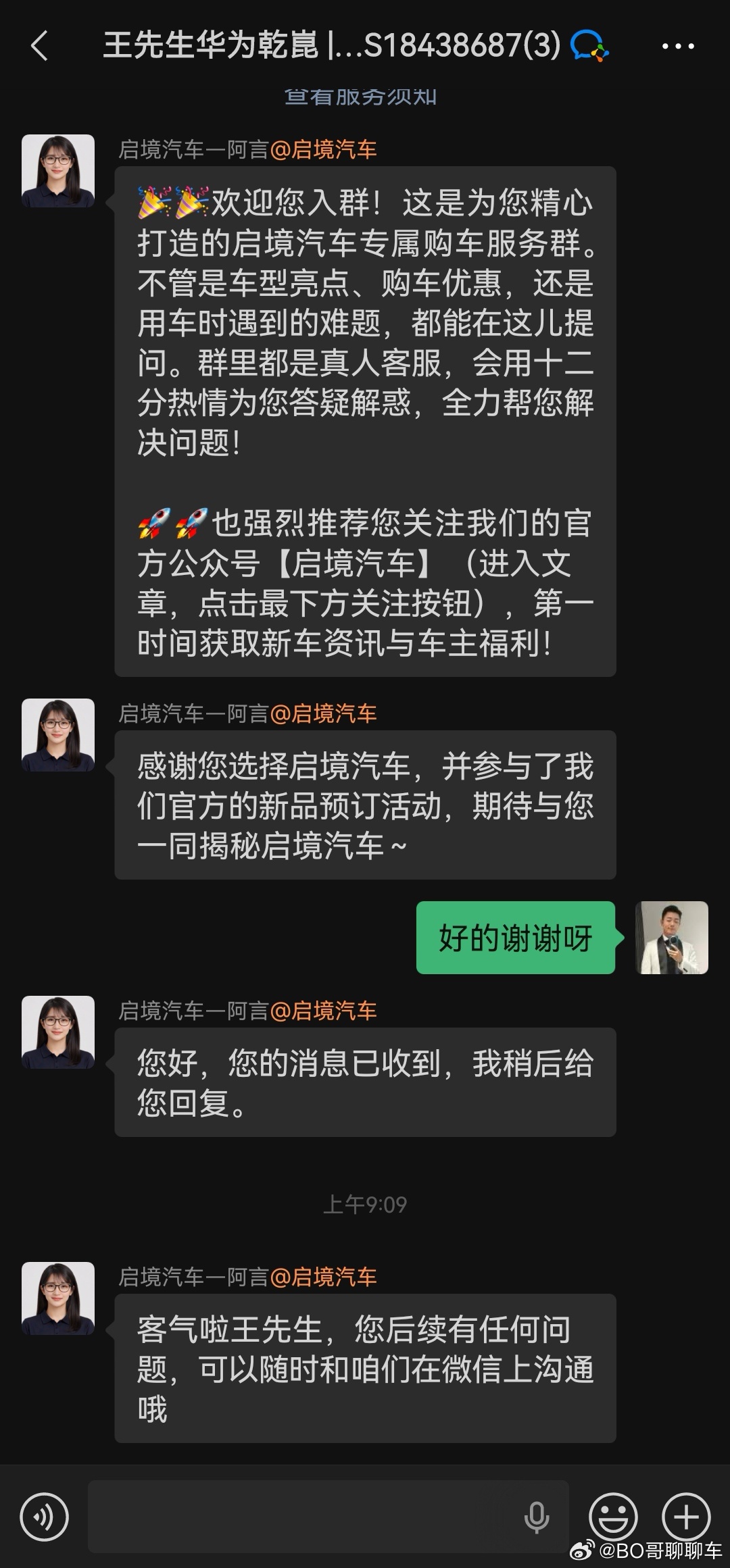 1、当晚官方就发短信表示了“感谢”和“关注”,而且还很智能的知道“今天晚上时间太晚了”就不打扰了,第二天白天再联系确认订单信息;一时间让我有点分不清,这是机器发的,还是人工逐一发的,多少带点人文关怀了;2、第二天官方就有小妹联系了我,确认了订单信息,并且在征得了我同意后添加了微信,并立马拉了一个“三人服务小群”,方便了解更多的官方信息和后续的提车信息等,虽然还没正式成为车主,就先让我“装”上了,这感觉,挺棒棒的哈哈!