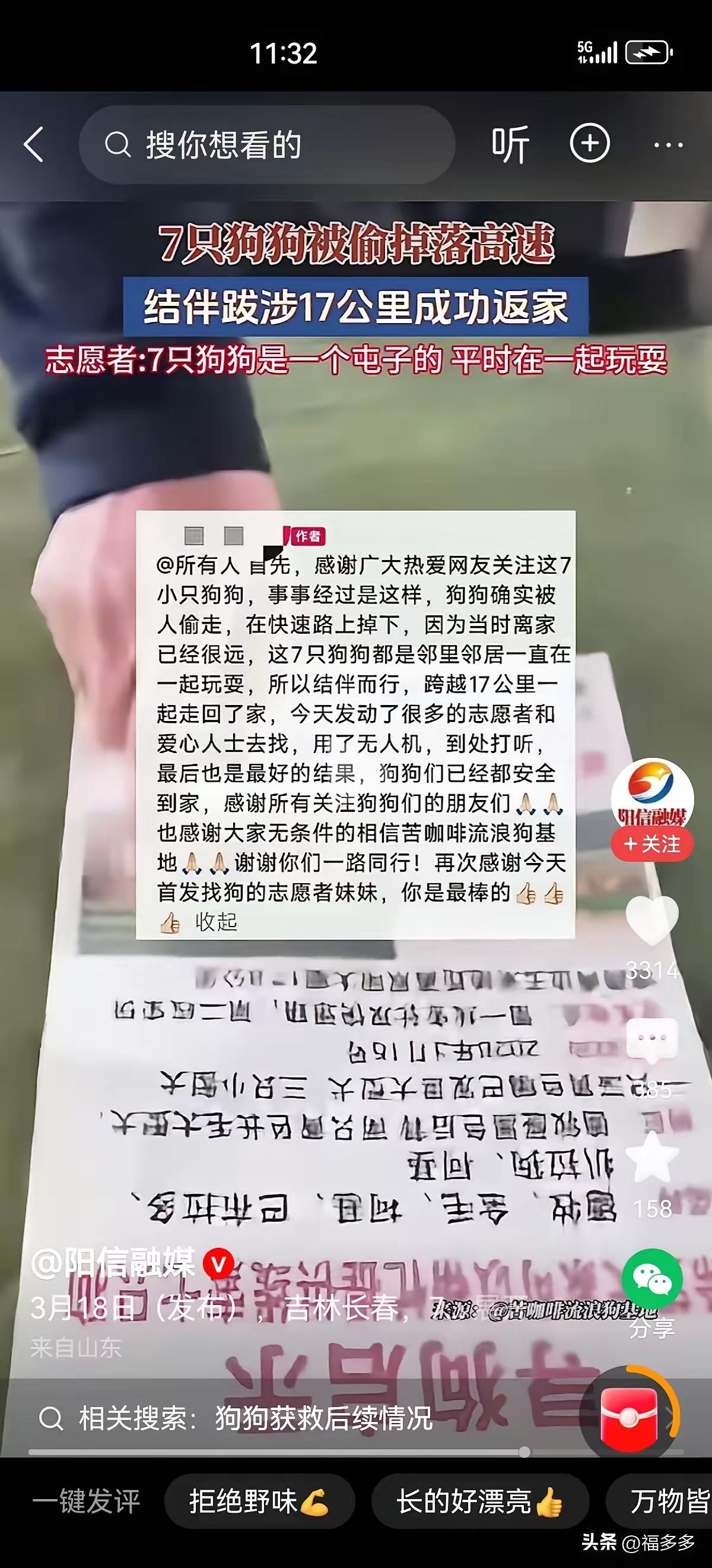 高速上,7只狗从偷狗贼的笼子里掉下来,居然没慌着各自跑,而是抱团走了整整17公里回家!领头的德牧硬是用嘴咬开笼子,自己牙龈都裂了,其他狗狗一看它受伤,愣是一步不落陪着走。 志愿者说,它们本来就是一个屯子里的“发小”,平时一起疯玩。可也有人质疑:“肯定是农村主人统一卖的,偷狗怎么可能一次偷这么多?反正不管怎么说,狗捡了一条命,主人已经得到钱了,以后别再卖了。” 不管真相如何,这患难七兄弟值得一个大大的赞!感谢路上伸出援手的好心人——好人一生平安!而那些偷狗贼,迟早遭报应,人在做,天在看,因果会轮回!
