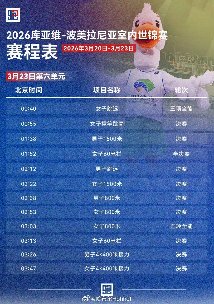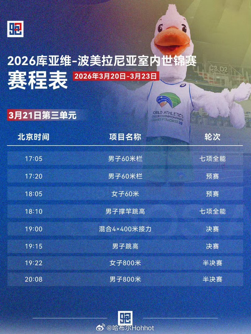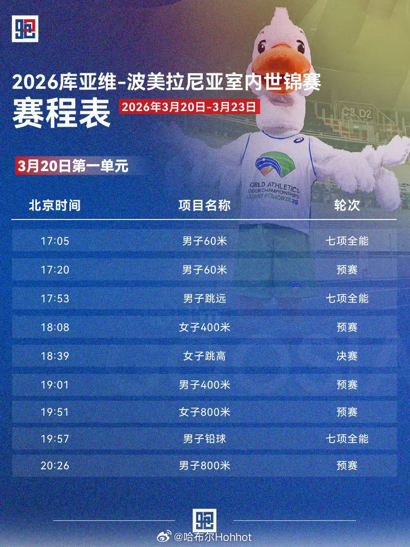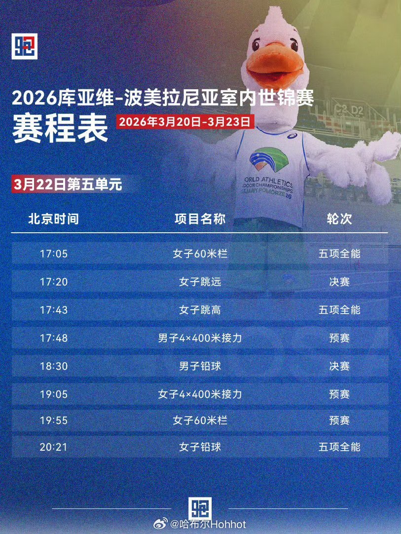 3月20-22日,2026世界室内田径锦标赛 将在波兰托伦,库亚维-波美拉尼亚打响。直播:央视体育成绩查询:网页链接制图田径说一哈你不知道的田径故事