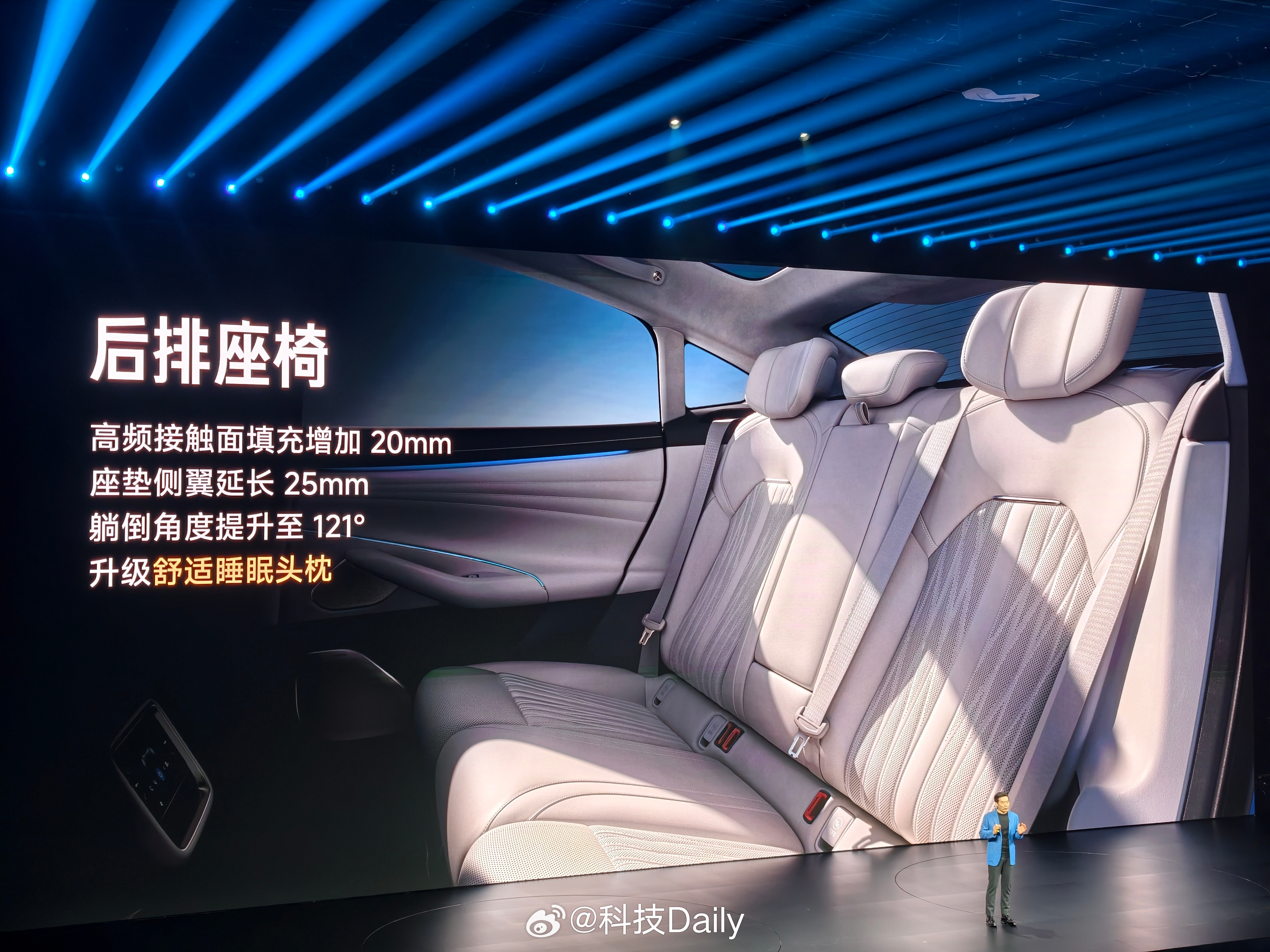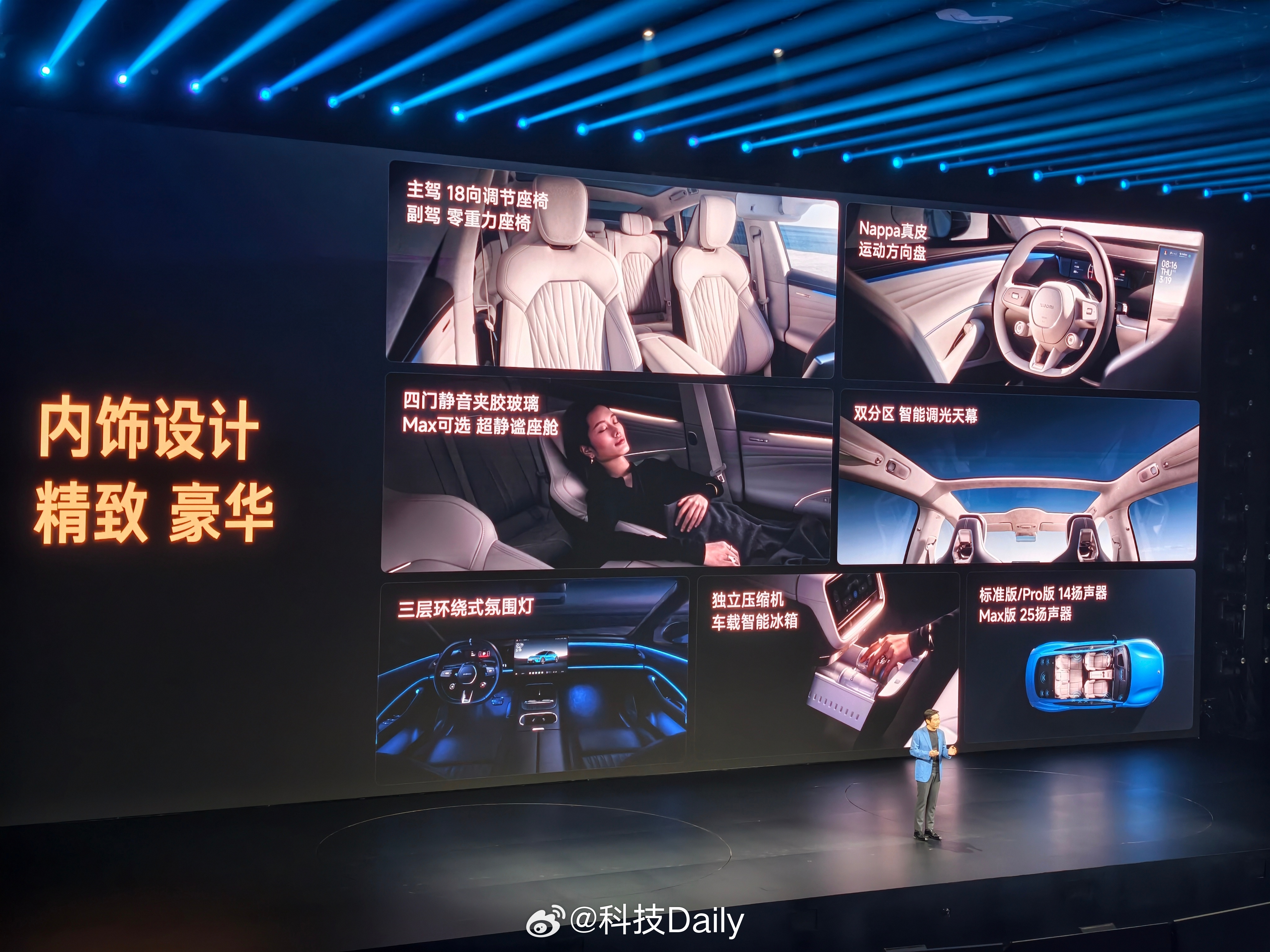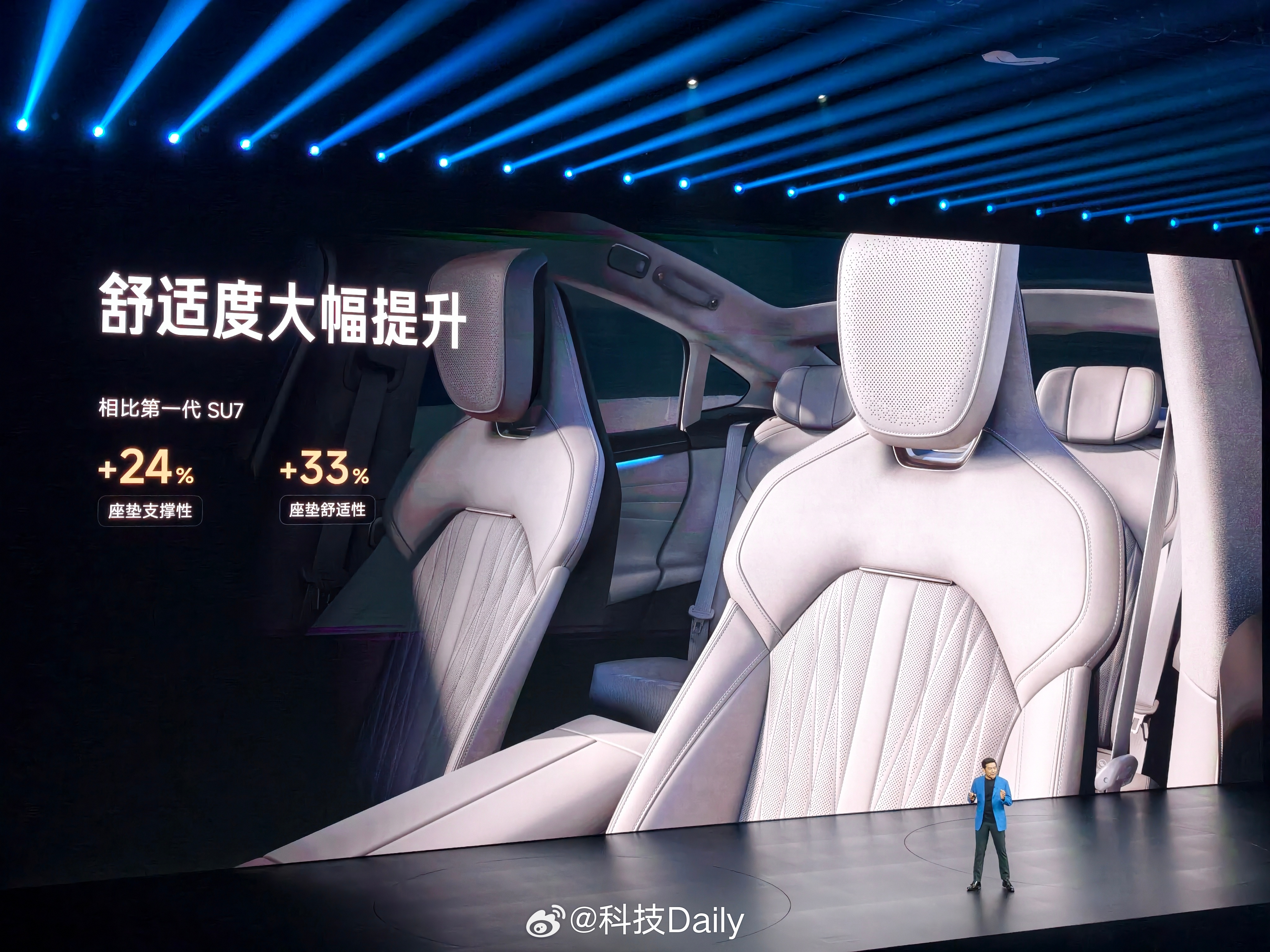 新一代SU7有啥不一样,先看外观,经典比例姿态,卡布里蓝新配色,新鲜感有啦。九款颜色,四大色系,前后摄像头支持高压清洗,这个功能好啊。外观重点看完看内饰,金属色饰板,运动方向盘,质感提升。有意思的是主驾运动座椅,做的更舒适了,支持18向调节,靠边侧翼调节很不错,10点式按摩,主动侧翼支撑全系标配,挺关键的。副驾更是带来了零重力座椅,后排带来了舒适睡眠头枕,100%软包覆细节到位了,感觉必须得试驾感受一下,内饰四款颜色,还是觉得浅色好看,独立压缩机冰箱好评,防晒也是SU7的基本操作,前后排天幕支持单独调节。现场被种草了香薰,想买,感觉就很有品味。小米发布会 北京·小米智慧产业园区