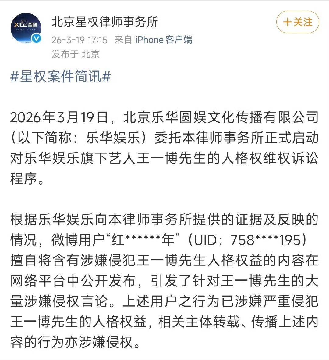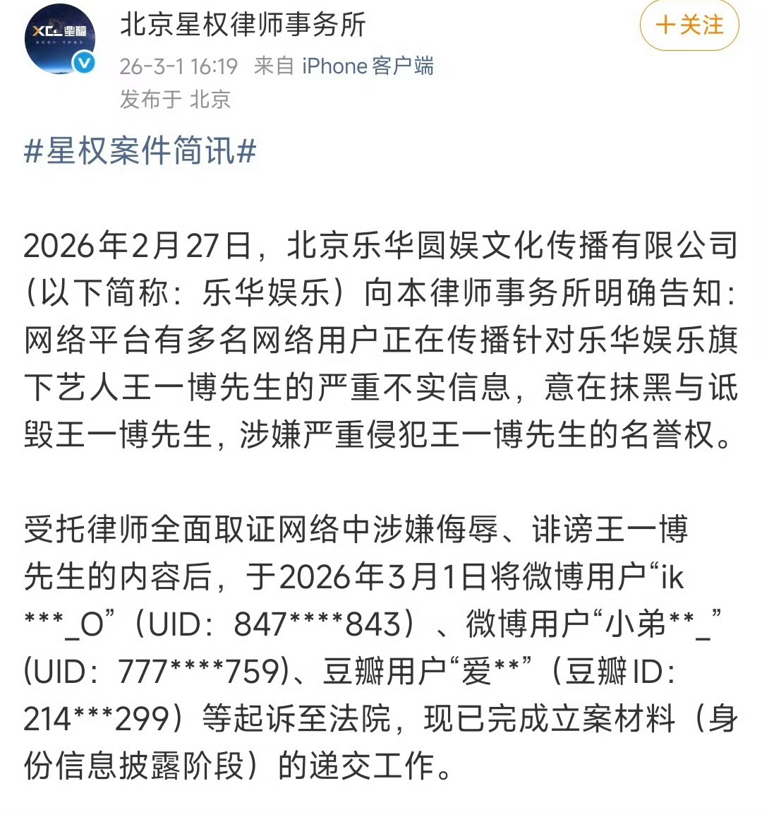 没错。李思瑾极其相关团队,借用私生身份造谣抹黑人王一博。乐华不仅发了严重声明,还进行了报警,星权律师事务所直接提告传谣者“一颗小虎头”