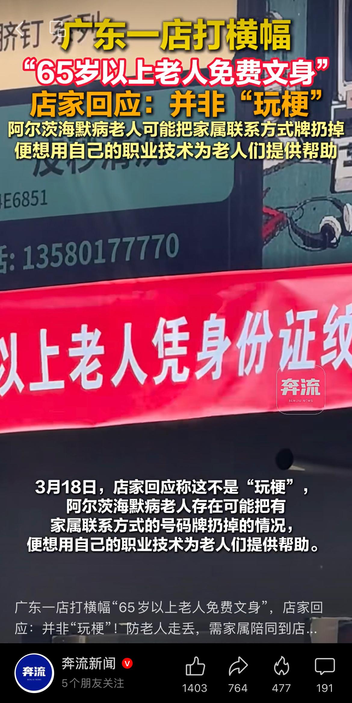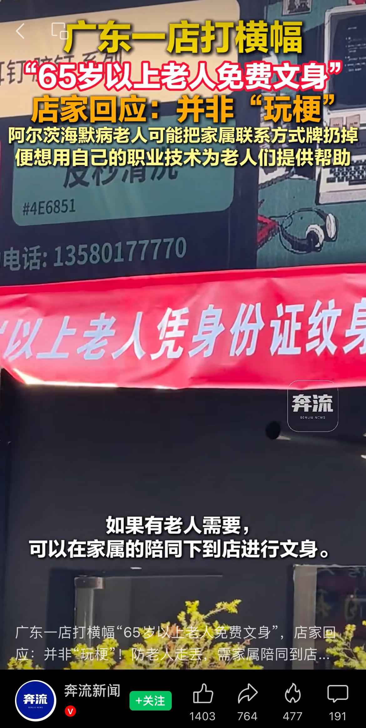 广东一店打横幅“65岁以上老人免费纹身”,店家回应:并非“玩梗”!防老人走丢,需