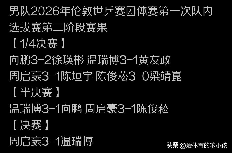 相信很多球迷都注意到了国乒男队参加世乒赛的第三名额已经有了归属。那就是通过队内两个阶段的比拼直接在队友争夺当中胜出的29岁老将周启豪。他也是成为了国乒男队在王楚钦,林诗栋这两个第一次时间锁定世乒赛团体赛参赛名额之后,第三个拿到参赛资格的球员。 只不过,明明是周启豪锁定是周启豪锁定世乒赛团体赛名额,但真正带火的却是他的年轻队友温瑞博。为什么我们会这样评价温瑞博呢? 一方面是温瑞博在这次的队内选拔赛当中同样成绩不俗,成为周启豪夺冠之外成绩最为突出的球员。也可能在有些球迷看来,温瑞博成为了周启豪胜出和锁定名额的背景板。毕竟他也是一路闯关,最后晋级队内选拔赛的决赛,并在决赛当中先胜一局的情况下1:3输给了周启豪,无缘第一时间锁定国乒男队世乒赛第三名额。 但是对于温瑞博来说,他是个年轻的不到20岁的小将,周启豪则是29岁的老兵。年轻人的这种闪光无疑更容易让人记住,也让他本人信心和能力上都有所提升。 而且温瑞博不但在这次队内选拔赛当中成绩突出,拿第二名,相对于另外的几位主要潜在的名额竞争对手,从徐瑛彬、向鹏、梁靖崑,到陈垣宇和陈俊菘、黄友政,相比起来,温瑞博已经是成绩第二突出的球员。确实稳定性和高光状态的保持都来始逐步占据上风。 另一方面,即使向鹏和梁靖崑的世界排名在温瑞博之前,但向鹏近期世界赛场上的成绩不够理想,梁靖崑更是受到伤病困扰。即使回归并且参与到世界比赛的争夺当中来,也参加了这次的队内选拔,但仍然能让我们看出他的腰伤在影响他的发挥。他也是在顽强坚持,整体上来说,不管是内战还是外战成绩都还不是特别突出,和自己相对理想的状态相差不小。 这个时候温瑞博相对稳定的发挥,又比较年轻的年龄优势,还有近期比赛当中战胜多位世界顶级名将和高手,比如雨果卡尔德拉诺、莫雷加德、科顿、邱党、张本智和等名将的这种经历,就会成为他继续展现竞争力,并在国乒队内证明自身价值的一部分。 所以即使现在温瑞博还未锁定世乒赛的参赛名额。但国乒教练组还有一定的自由选择度,而且也还会有其他竞争机会。总之在最后的名额争夺战当中,温瑞博还是有后来居上锁定一个席位的机会。特别是世界杯的舞台对温瑞博来说十分关键,如果成绩突出,他入围世乒赛团体赛阵容将更加水到渠成。 只是当外协会的主要对手对温瑞博的实力认知产生变化,也都开始对温瑞博给予重点照顾,也就是说越来越重视这位对手,并有可能对他进行重点研究时,温瑞博还能否展现这种竞争力,并持续在原有基础上再提升自己的综合竞争力,还有打大赛的阅读比赛能力,就将成为他这次是否晋级世乒赛团体赛参赛名单,未来又是否可以在国乒男队五大主力位置里面拥有一个席位的关键了。 那么大家是否看好温瑞博的未来前景,又对世乒赛最终名额当中有他一个席位持什么样的观点和态度呢?也期待朋友们给出自己心中的答案,大家共同交流探讨。