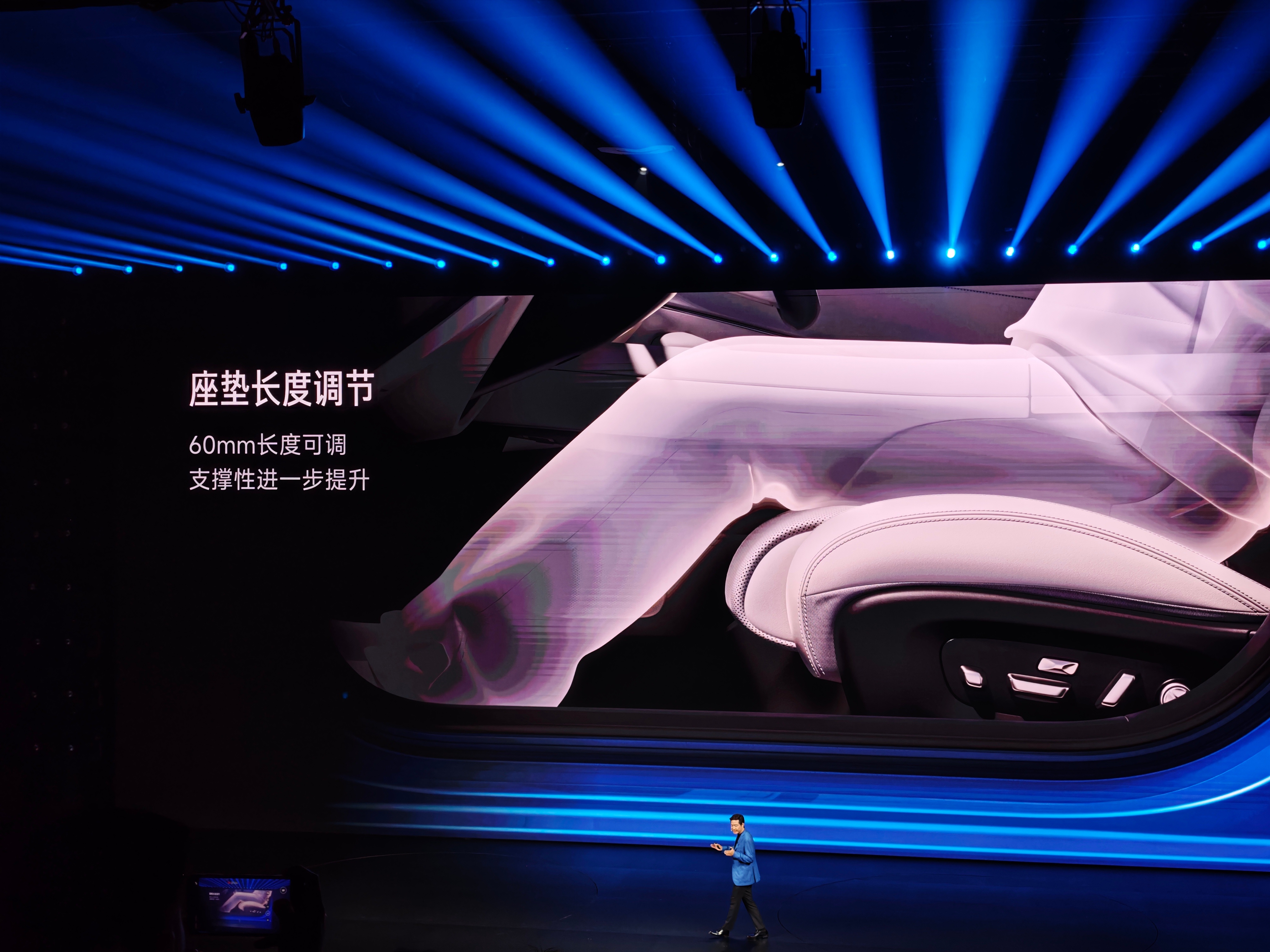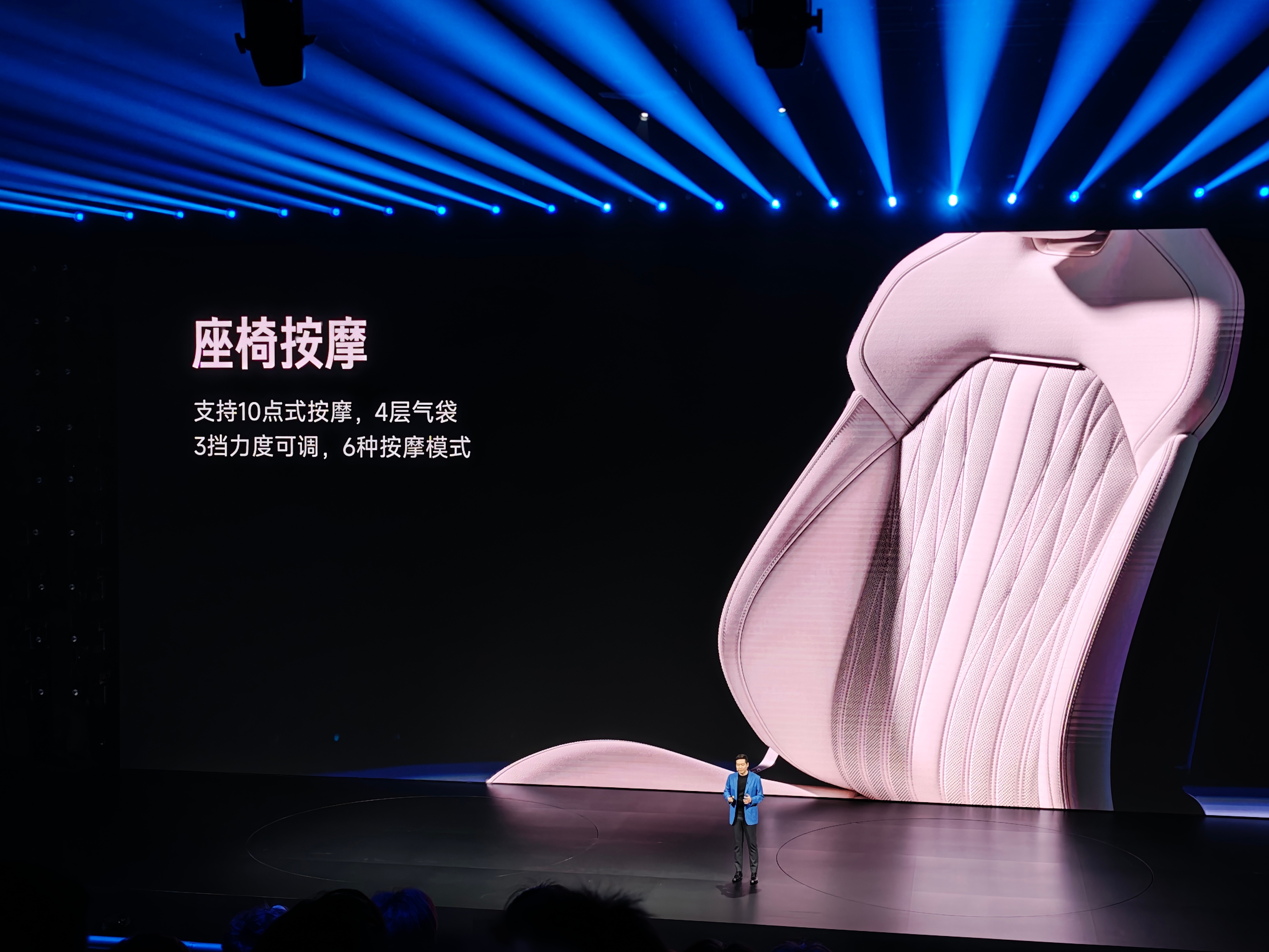 这次新SU7的座椅升级非常大,全系给了主驾18向调节,座椅按摩,支持6cm腿托伸