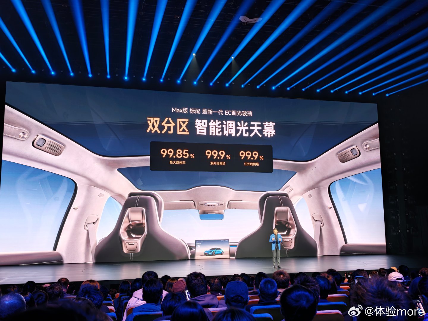 防晒升级,Max版标配最新一代 EC调光玻璃,双分区智能调光天幕。