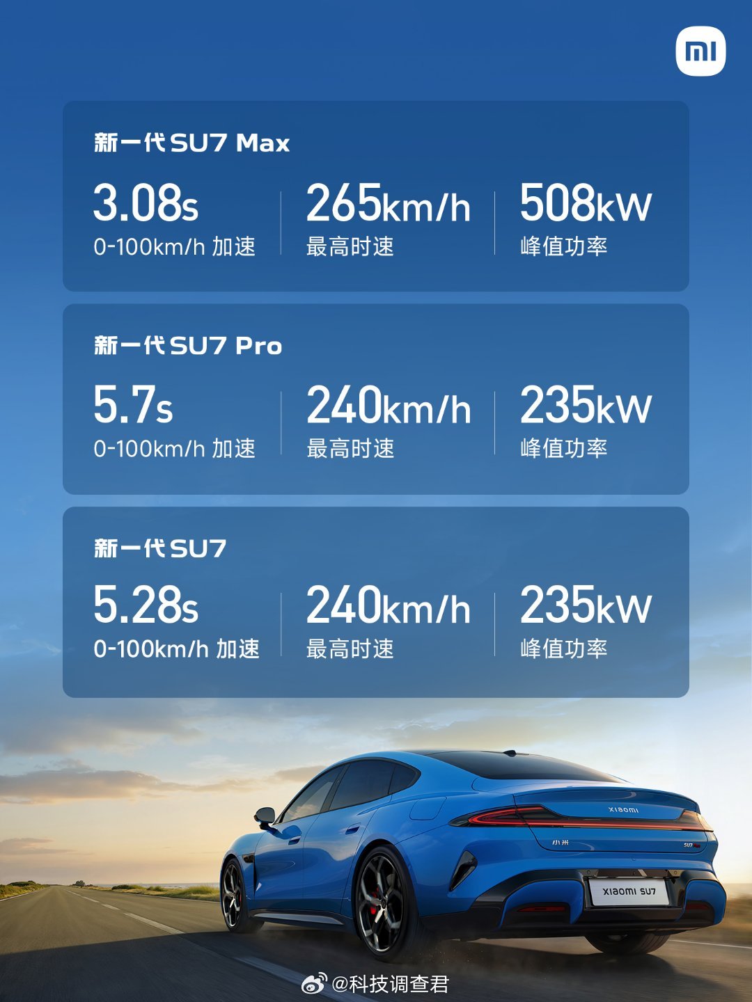 而且经过两年的调教之后更好开了,动力全系搭载了V6s Plus 超级电机,Max版零百加速3.08s,最高时速265km/h;而且续航也有升级,Pro版 CLTC续航902km,Max版CLTC续航835km,标准版CLTC续航720km 小米新一代su7今日发布