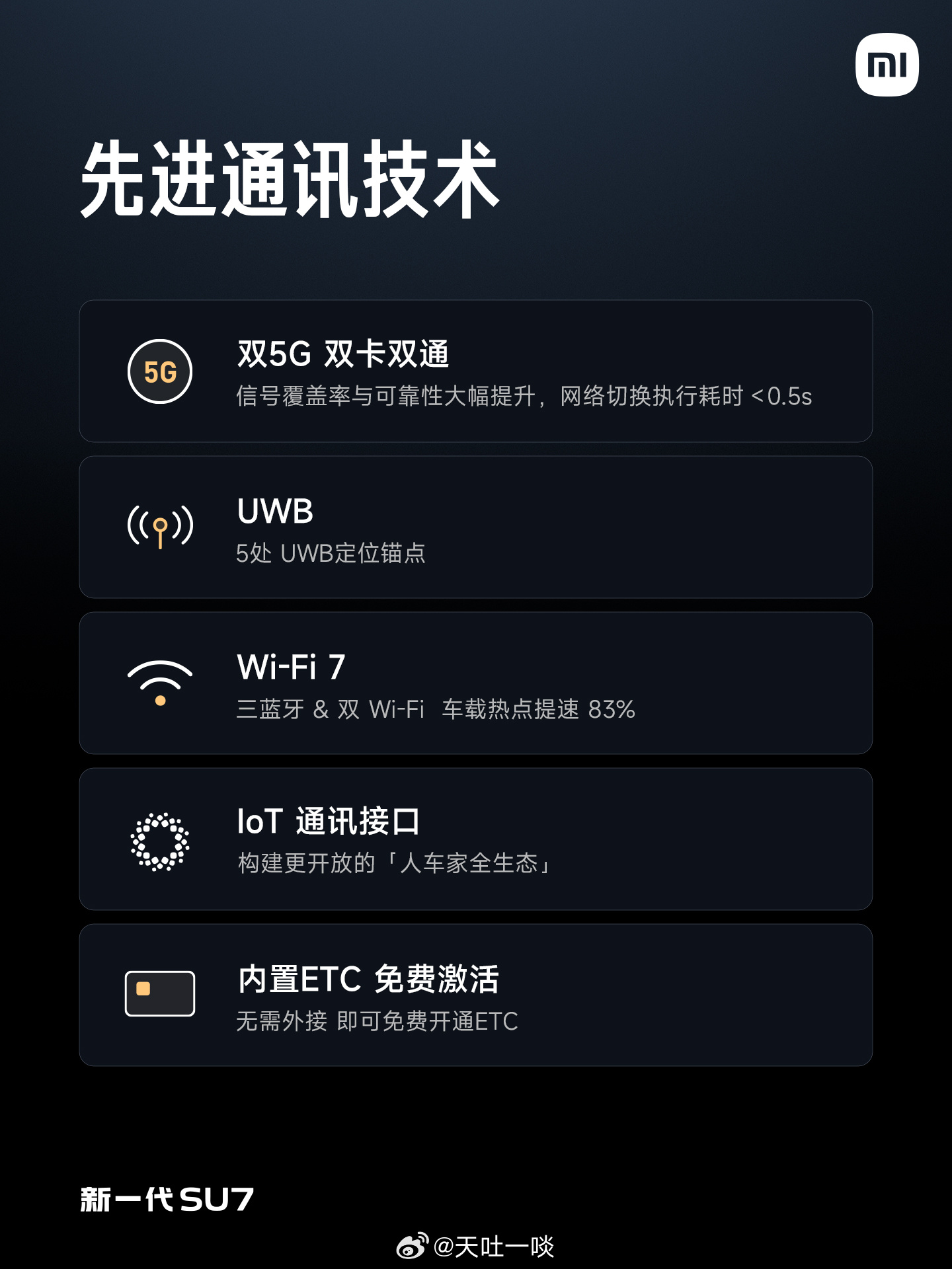 新一代SU7 的电子电气架构也进行了全面升级。域控制模块四合一,面向智能时代,更高集成,更强算力。搭载旗舰级芯片,打造先进的智能座舱和辅助驾驶体验。核心板通过车规级测试,安全值得信赖;全新的电子电气架构还带来更强的体验,支持双5G 双卡双通、内置ETC免费激活等功能。哨兵模式也有升级,更省电、更智能、更安全。小米新一代SU7今日发布
