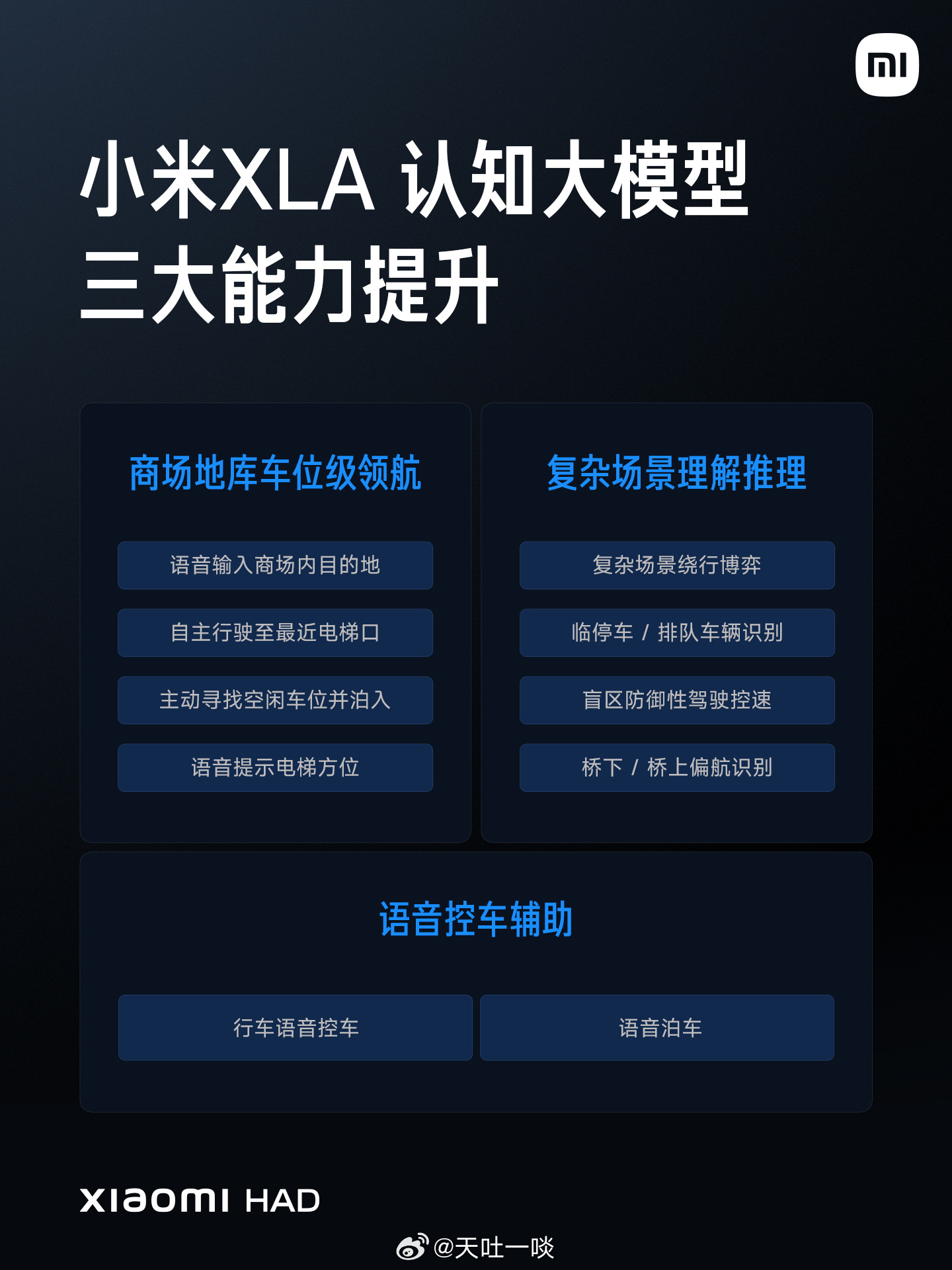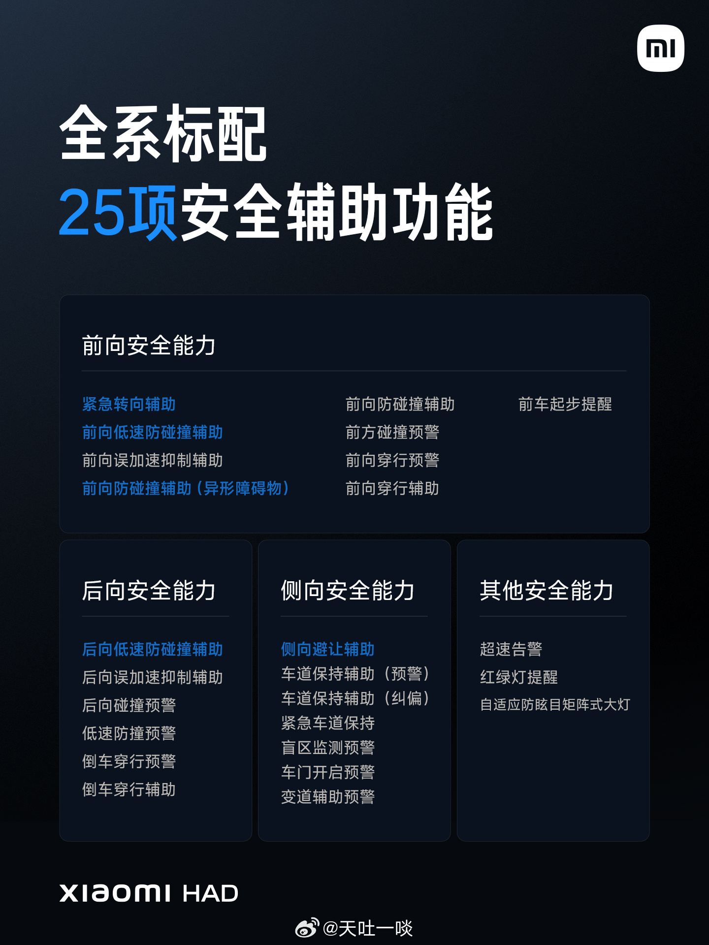 新一代SU7 辅助驾驶软硬件也全面升级。从硬件上讲全系标配激光雷达,满配辅助驾驶。从软件上讲全系标配小米HAD,搭载小米XLA认知大模型,三大能力提升。从体验上讲面对大型障碍物,可以合理避障绕行;还增加了语音控车,在商场地库的实现了「车位级」领航。小米新一代SU7今日发布