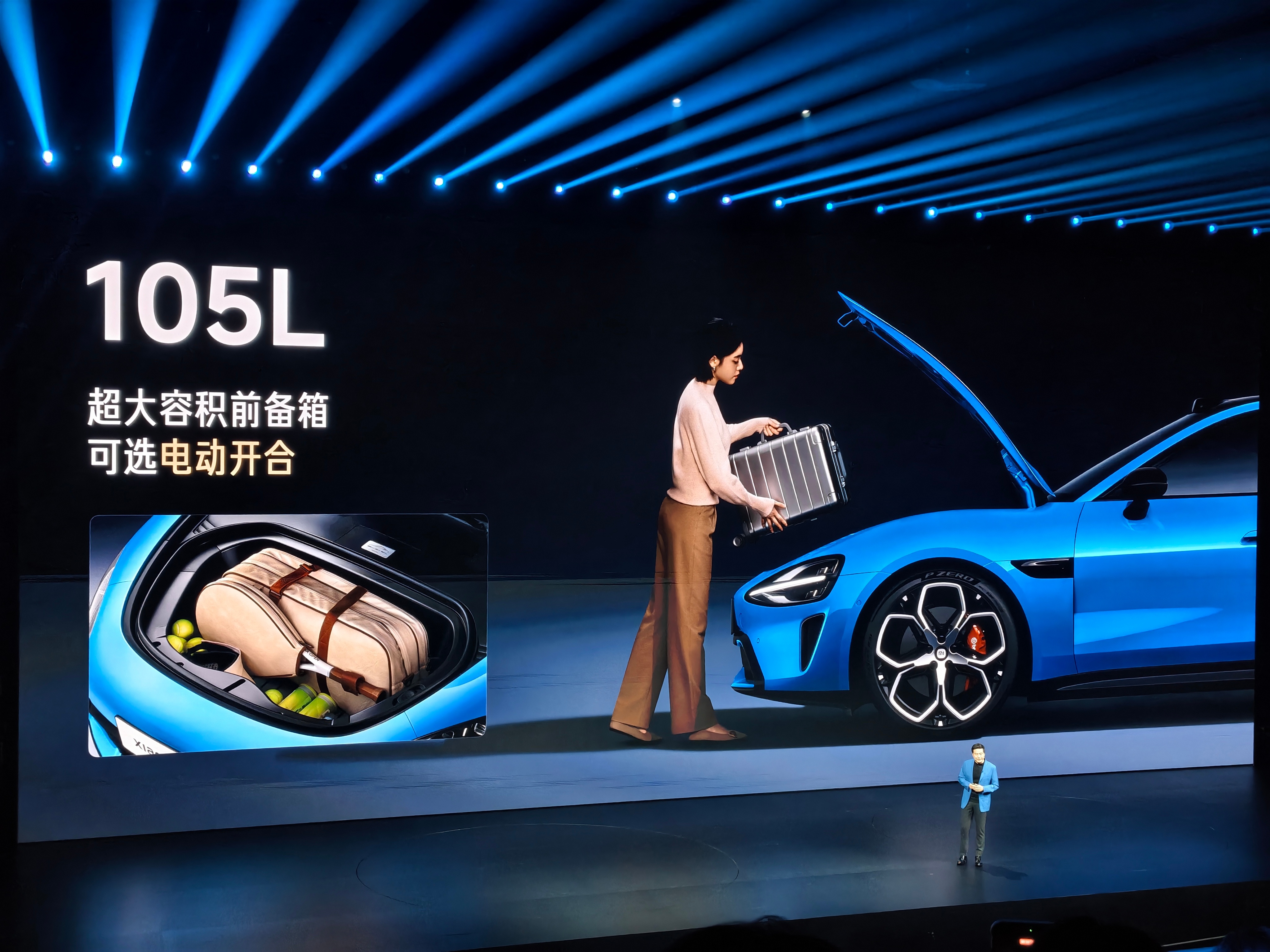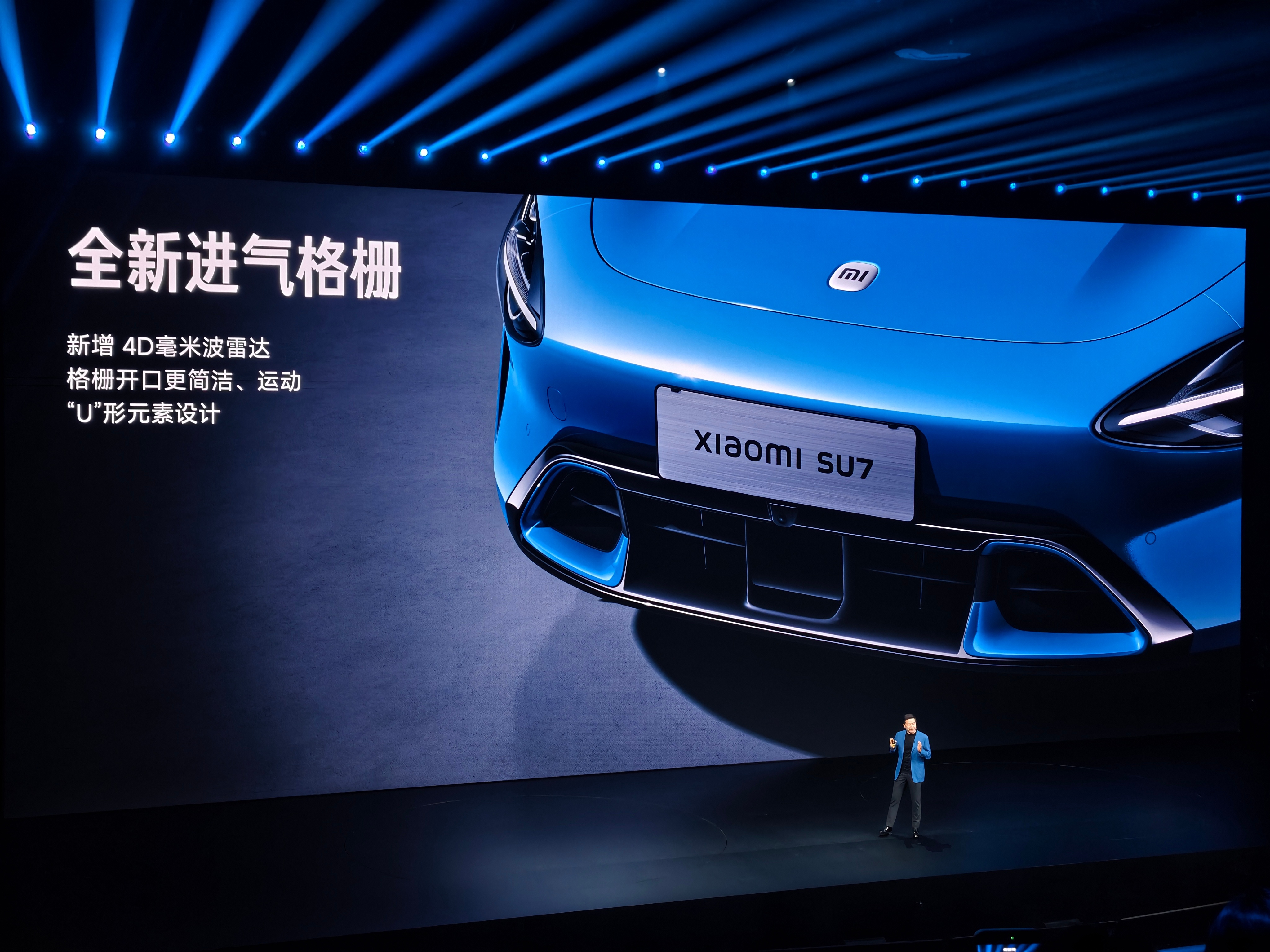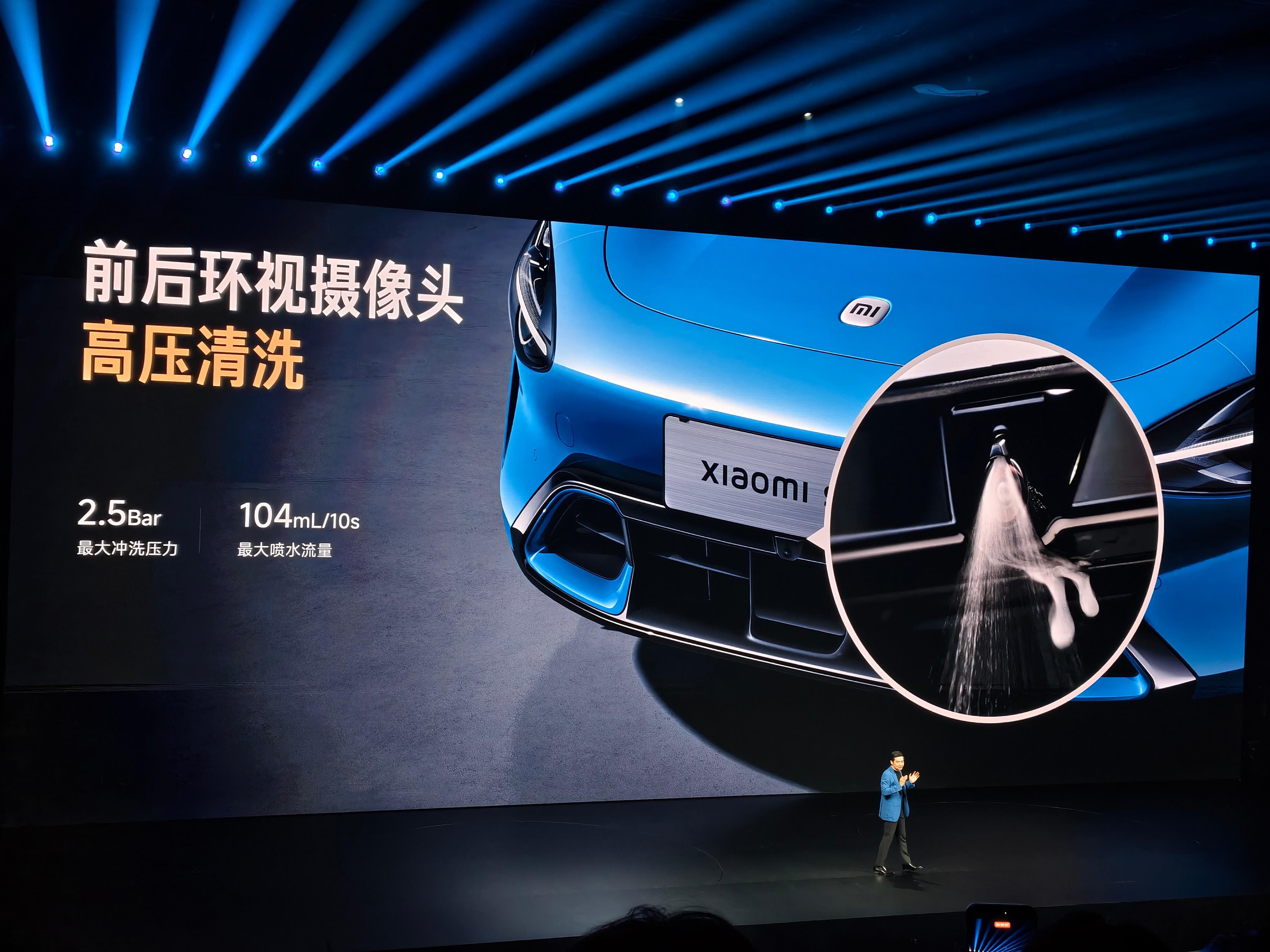 小米新SU7 采用全新进气格栅设计,前后环视摄像头配备高压清洗功能,前备箱可选电