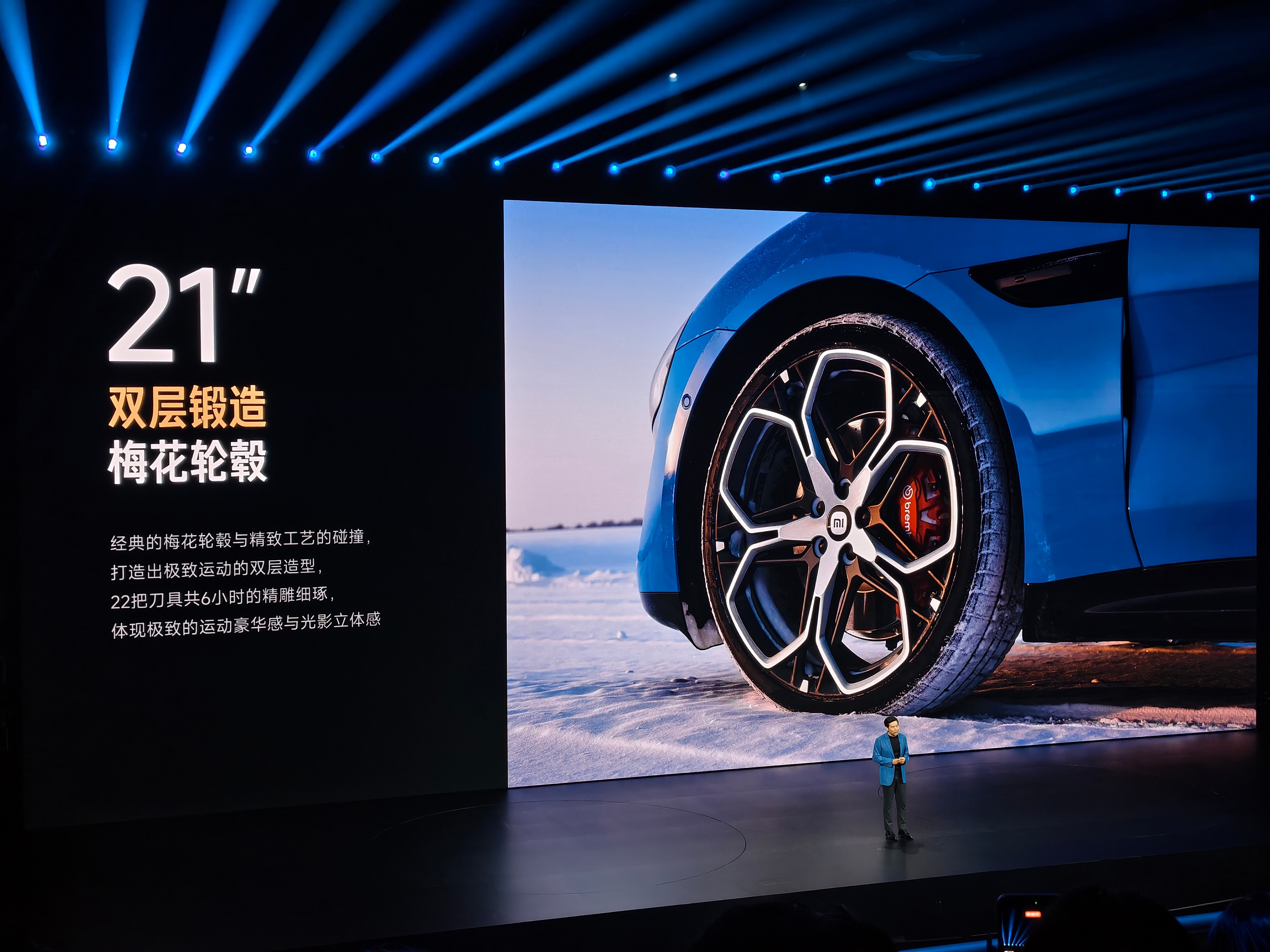 小米新SU7 采用全新进气格栅设计,前后环视摄像头配备高压清洗功能,前备箱可选电动开合,容积高达105L,提供21英寸双层锻造梅花轮毂,内饰提供迷雾紫、暮光红、砂陶米、暗夜黑可选。