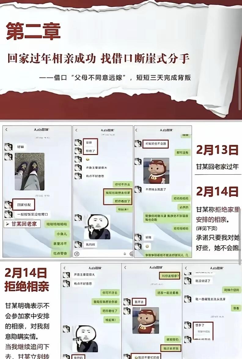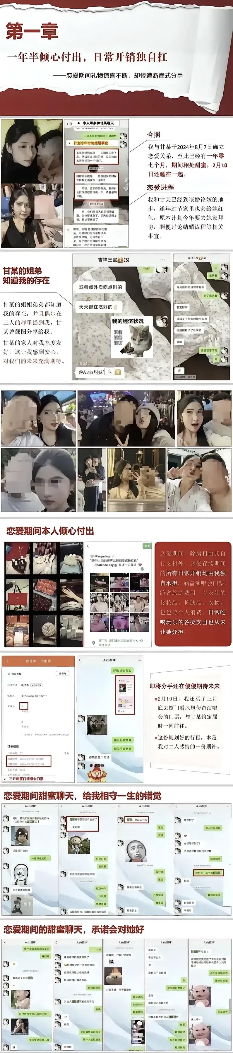 江西宜春小伙怒晒2.8万PPT:19个月深情被分手,女友转头回家订婚,恋爱的尽头是谁也别想体面, 相恋时,男生从房租到演唱会门票,从化妆品到日常奶茶,把所有开销独自扛下,连未来婚房都在规划里。女方甘某一边说着“我会一辈子都陪着你”,一边在情人节当天偷偷相亲,7天内就和新对象完成见家长、拍全家福、收16.8万彩礼定金的全套流程,最后用一句“父母不同意远嫁”完成断崖式切割分手,无缝衔接新欢。 更讽刺的是,直到男方发现真相,女方还在心安理得收着他的关心,甚至把男方妈妈的微信拉黑删除,甩下一句“感情是两个人的事,别人无权道德绑架”。 崩溃的男生连夜整理出30页PPT,2.8万的恋爱账单、甜蜜聊天记录、女方订婚现场照,甚至私密记录都被摊在阳光下——他不是要赢,是要让所有人看见,自己掏心掏肺的19个月,不过是一场精心策划的“骑驴找马”备胎配角。 有人说他太极端,把体面撕得稀碎;可谁又能懂,当一个人把全部未来赌在另一个人身上,最后发现自己只是备选时的绝望? 这哪里是分手,这是一场蓄谋已久的背叛。当“父母不同意”成了最体面的遮羞布,当深情成了可以被随意消耗的筹码,我们到底该怎么去相信爱情? 也有网传说两年来女孩承担了房租水电什么的,总之,走到互撕这一步,已经没有赢家! 江西情侣分手PPT
