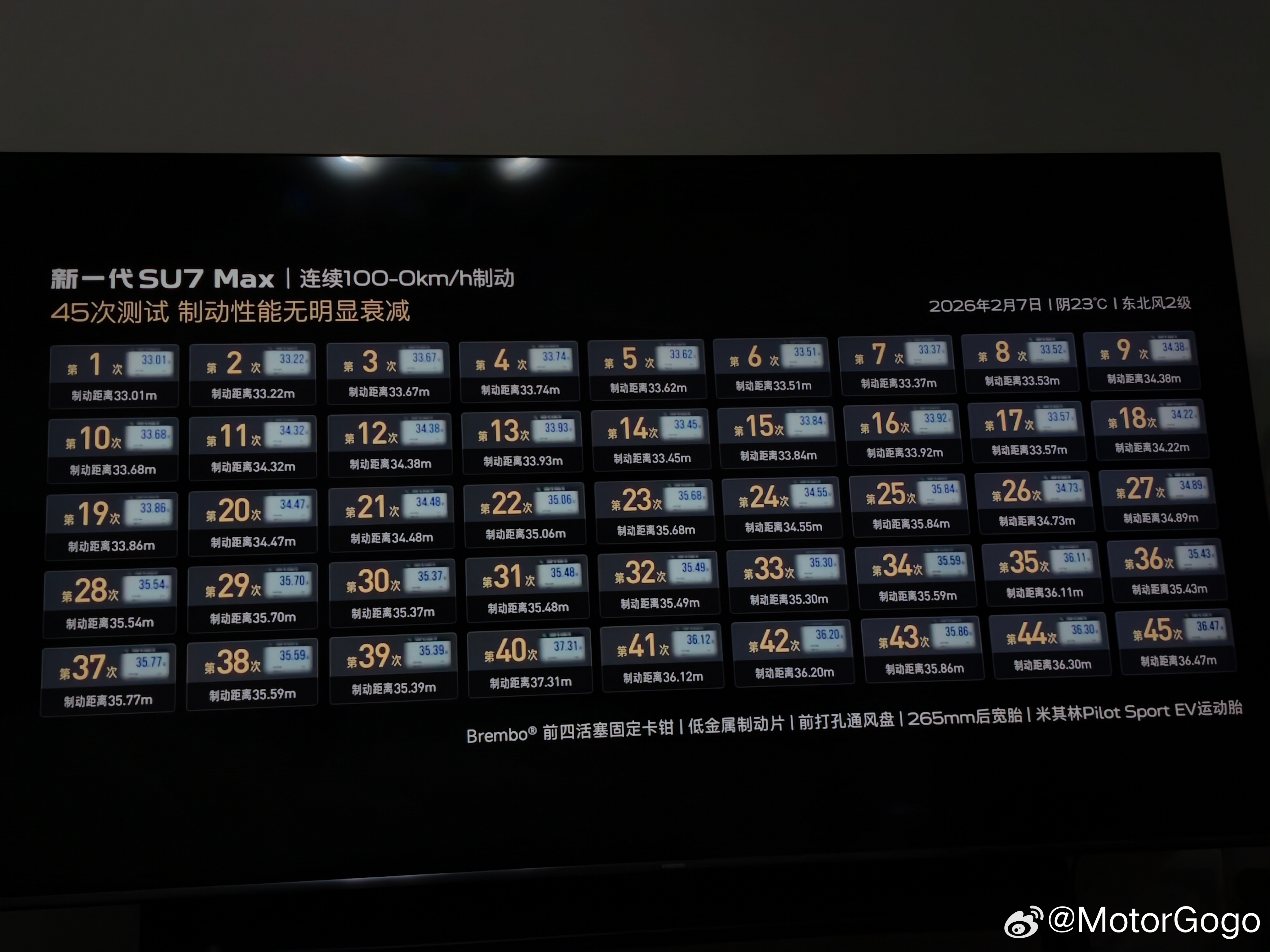 连续 40 次 100-0km/h刹车,最长距离也只有 37 米出头。