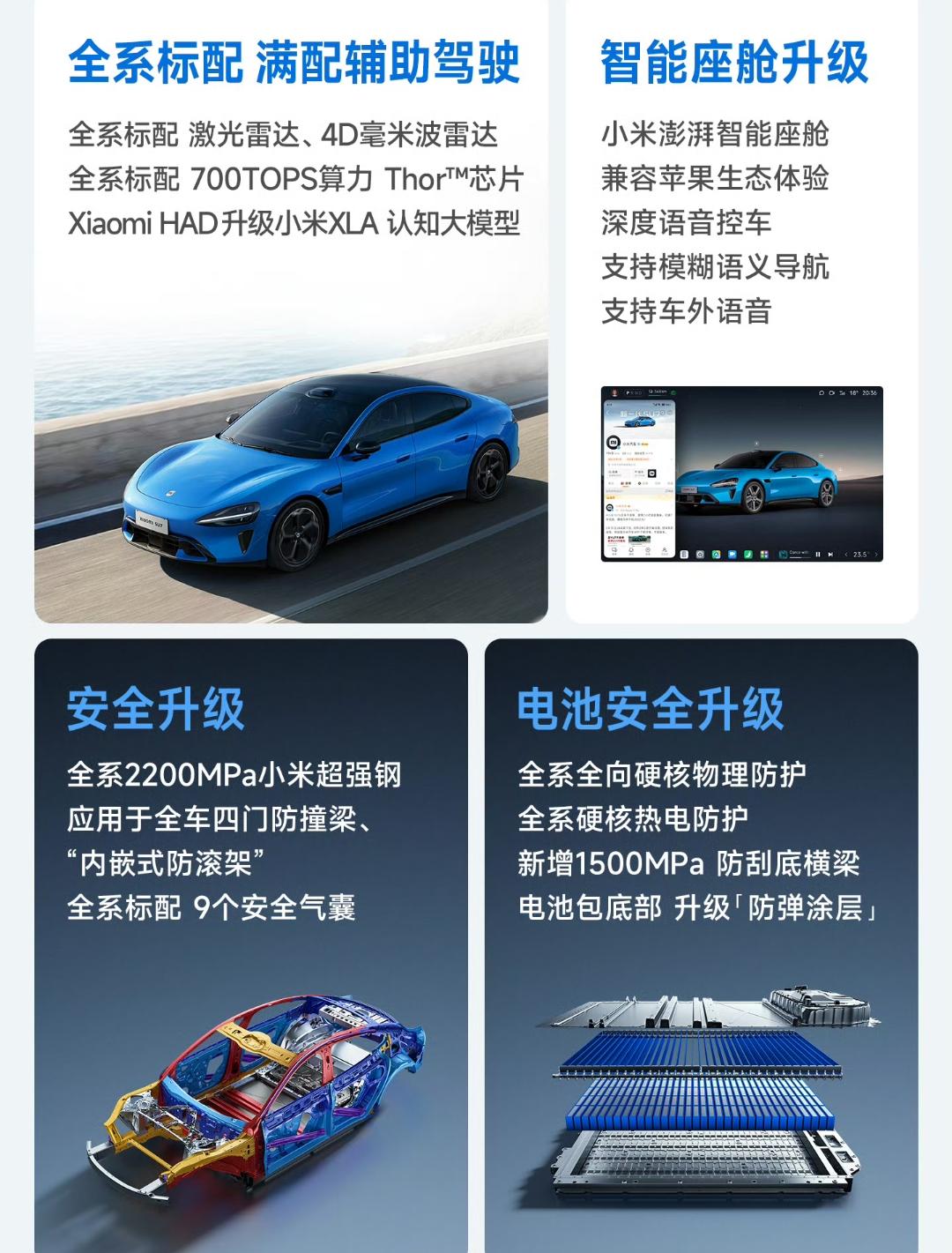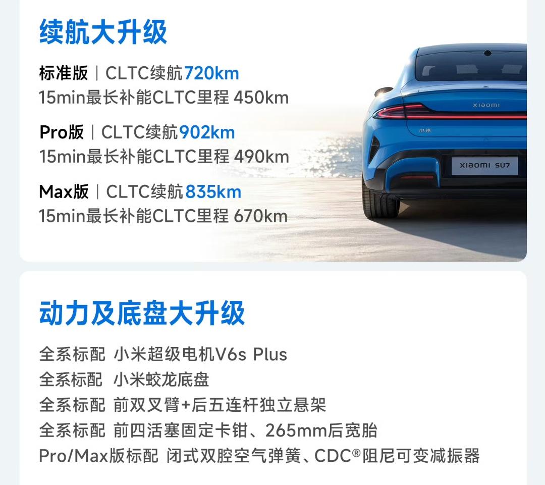 新一代小米SU7发布,21.99万元起,比上代涨价4000元。 小米SU7标准版 720KM:21.99万元 小米SU7 Pro 902KM:24.99万元 小米SU7 Max 835KM:30.39万元 -续航全面提升 -充电效率提高:标配版和Pro版为752V高压平台,Max版为897V高压平台 -算力提升&智驾下放:全系标配激光雷达+HAD端到端+700TPOS算力,2024款标准版仅84 TOPS -配置下放:全系标配V6s Plus超级电机、前四活塞卡钳、座椅通风+加热+按摩 这价格有诚意,标准版配置这次升级很大,全系价格只涨了4000元,油价大涨这车估计又要卖爆了。