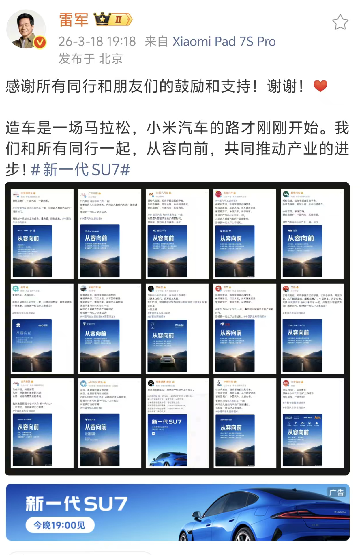 多家车企高管齐聚新SU7发布会小米发布会 军儿的朋友圈,可以,昨天是各个友商恭贺,今天是各个大BOSS亲临现场观看发布会胡峥楠林世伟陈年王兴兴李想雷军何小鹏王辉王传福张建勇卢伟冰 【小米新SU7发布会请来半个车圈】