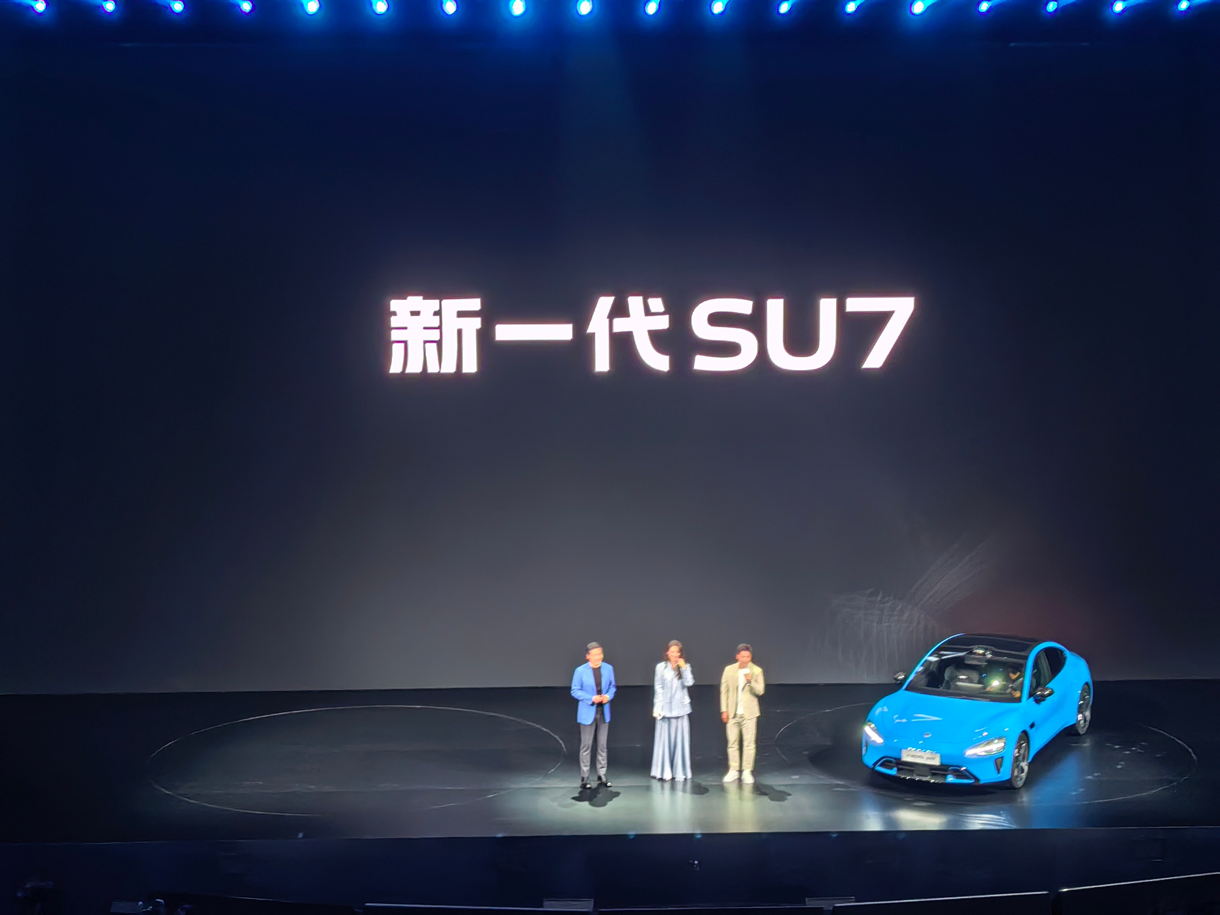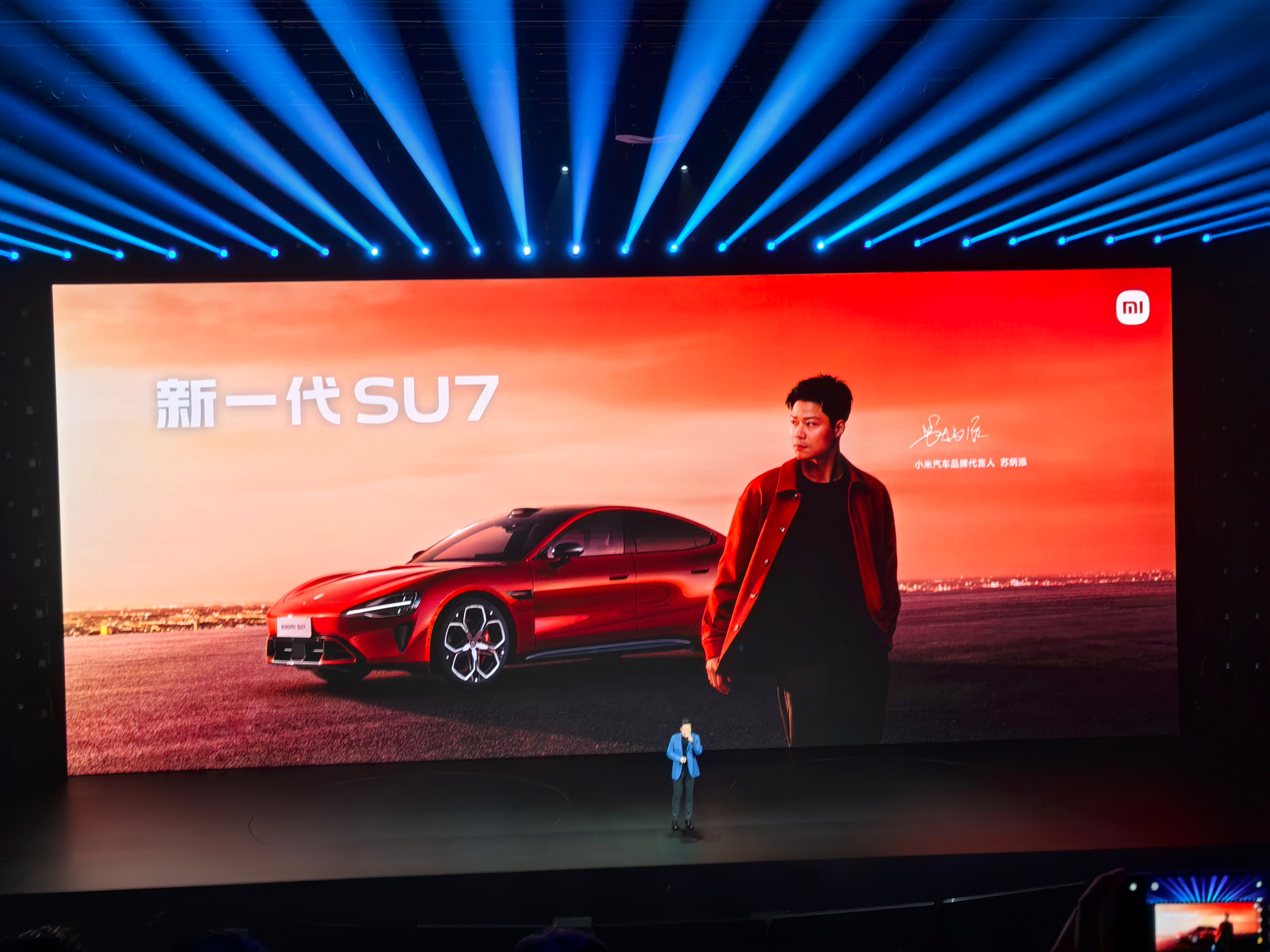 小米发布会 发布会现场,新一代小米SU7的两位代言人来了,舒淇和苏炳添,一个谐音梗舒(SU)淇(7),一个苏神的速度感,想记不住都难~ 小米新一代SU7今日发布