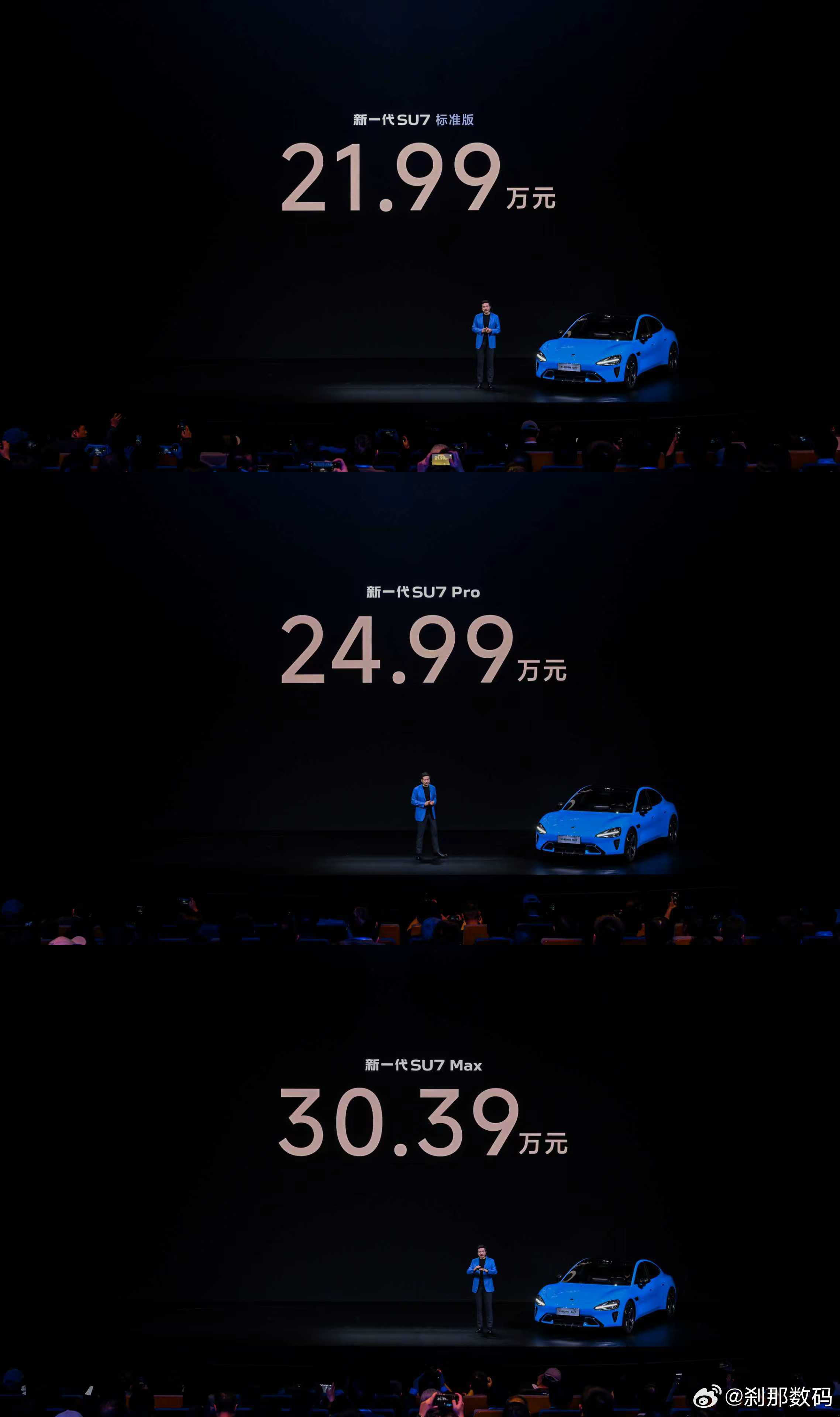 新一代小米SU7正式发布,刹那纯配置汇总:价格/续航标准版 (21.99万):CLTC续航 720km。Pro版 (24.99万):CLTC续航 902km。Max版 (30.39万):CLTC续航 835km。充电:全系15分钟补能450~670km不等。