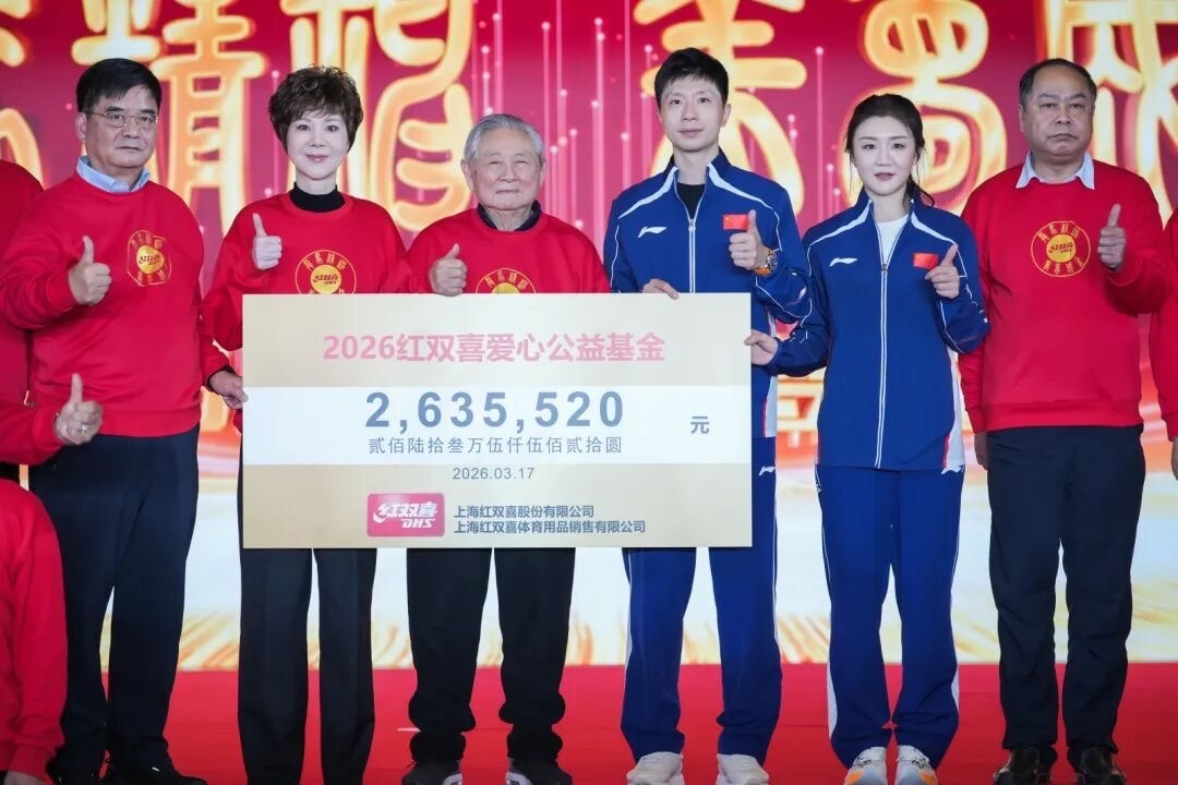 2026年红双喜爱心公益晚会3月17日在上海举办。徐寅生、曹燕华、马龙和陈梦参加了这场“龙马精神,美梦成金”主题的公益晚会。马龙、陈梦……等12名球员亲笔签名的球拍+球套装,由参加晚会的近150家红双喜全国销售伙伴积极参加义购,募集635520元,红双喜另行捐赠200万元,合计2635520元,构成了2026年的红双喜公益基金总额。