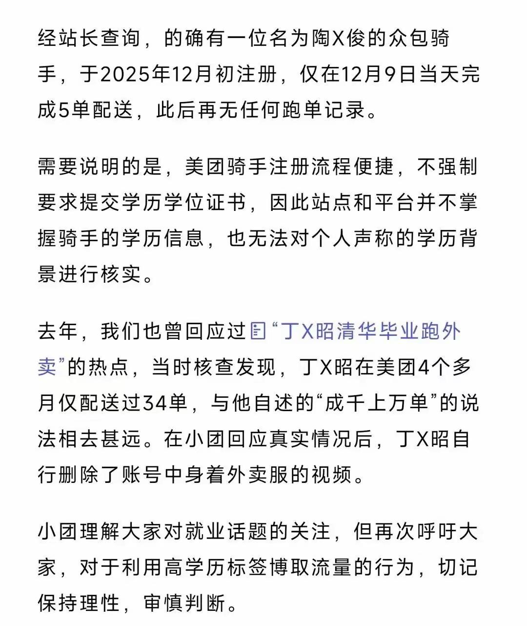 高考第一名北大毕业生送外卖?美团回应:注册骑手仅送了5单!实际上是为了起号! 这个名叫陶文俊的人,在他自己的朋友圈里面公开承认是为了旗号而编造的谎言,从野寨中学也可以看出,该考生是当年分数最高的文科考生。 从他的朋友圈里面看,全都是和教培有关的,然而如此不诚信的行为就算一时获得了流量也终将会被流量反噬。 这和他在视频中介绍的完全不同,毕竟外卖骑手与一个市的状元联系到一起,带来的话题度是非常高的。 各位是怎么看的?欢迎评论区留言。