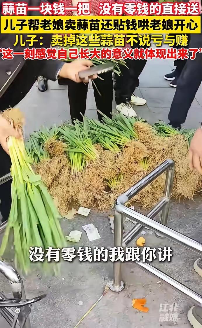 近日,安徽蚌埠,一老人自己种的蒜苗卖不出去,让儿子处理掉,儿子把蒜苗拉到街上来卖,一块钱一把,没有零钱的直接送,一会就把蒜苗卖完了,最后自己倒贴200凑给母亲,见母亲开心的样子,他觉得十分值得!网友:最甜的“反哺”! 事件的主人公是当地一位65岁的老人,一辈子勤劳节俭,闲不住的她在自家一亩多地里种满了蒜苗,从播种、浇水到施肥,日复一日悉心照料,盼着蒜苗丰收后能换些零花钱,也算是给自己的辛苦付出一个交代。 老人在田间忙活的日子,从来没有过丝毫懈怠,初春播种时蹲在地里逐行栽种,盛夏生长期顶着烈日浇水除草,就连雨天都要跑去地里查看蒜苗的长势。她的子女多次劝她放下农活安心养老,她始终不肯答应,在她的认知里,只要身体还能动,就不能靠着子女养活,靠自己双手劳作换来的收获,才最让自己心安。蒜苗迎来丰收却无人问津,老人的情绪肉眼可见地低落,看着堆在院里的蒜苗整日发愁,这份失落不是因为没挣到钱,是自己大半年的心血没了着落,心里满是不甘。 儿子深知母亲的执念,他没有劝说母亲看淡得失,而是立刻将蒜苗装车拉到街边售卖。他没有刻意抬高价格,就定了一块钱一把的亲民价格,遇到买菜的老人没带零钱,或是路人只是随口询问,他都直接将蒜苗递过去,分文不收。街边的街坊邻里得知这是老人亲手种的蒜苗,又了解到老人的心意,都主动围过来购买,有人多付几块钱表达心意,有人一次性买走多把,原本滞销的蒜苗,在短短几十分钟内就全部售罄。 售卖蒜苗的总收入仅有几十元,这点钱根本无法慰藉母亲的辛劳。儿子没有丝毫迟疑,从自己的钱包里拿出200元现金,和卖蒜苗的钱整理平整后,快步回到家中。他将凑好的钱递到母亲面前,语气欢快地告诉母亲,蒜苗特别受欢迎,很快就卖光了,这是全部的收入。 老人接过钱的那一刻,脸上的愁容瞬间消散,眉眼间满是藏不住的喜悦,她反复数着手里的钱,不停跟儿子念叨自己的辛苦没有白费。她把钱仔细放进贴身的衣兜,时不时伸手摸一摸,那份满足感是任何物质都无法替代的。儿子看着母亲孩童般开心的模样,心里满是欣慰,他清楚这200元不算多,却能让母亲感受到自己的价值,这份付出远比金钱更有意义。 当下社会里,很多年轻人对孝顺的理解停留在物质层面,总觉得给父母足够的钱财、购买贵重的礼品就是尽孝,却忽略了父母内心的真实需求。步入老年的父母,早已不再追求物质享受,他们更渴望被认可、被需要,渴望自己的劳作与付出能得到肯定,渴望依旧能成为子女眼中有用的人。 这位儿子没有用华丽的方式尽孝,只是精准读懂了母亲的心思,用最简单直接的方式守护了母亲的自尊与快乐。他没有戳破蒜苗滞销的真相,没有否定母亲的劳作,而是用倒贴钱的小善意,成全了老人一辈子的勤劳与执念。这样的反哺,没有轰轰烈烈的情节,却扎根在生活的细节里,藏着最真挚的孝心。 真正的孝顺,从来不是单向的给予,而是站在父母的角度,理解他们的坚守,呵护他们的小小心愿,让他们在晚年依旧能感受到自身的价值。 各位读者你们怎么看?欢迎在评论区讨论。