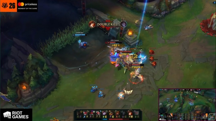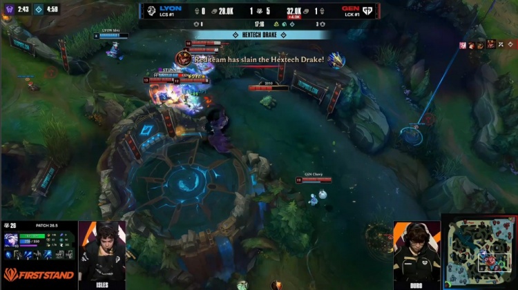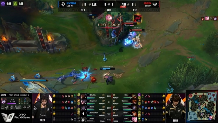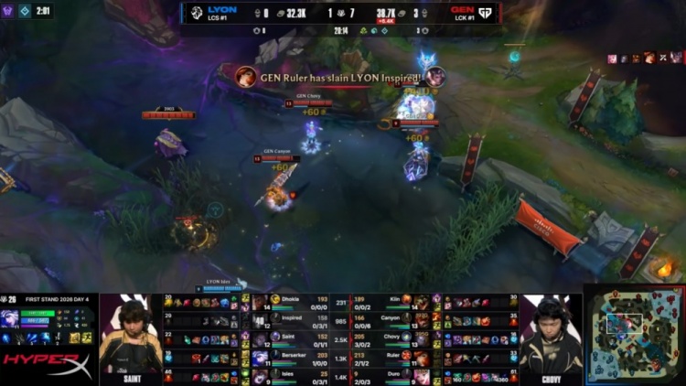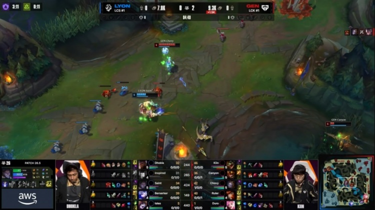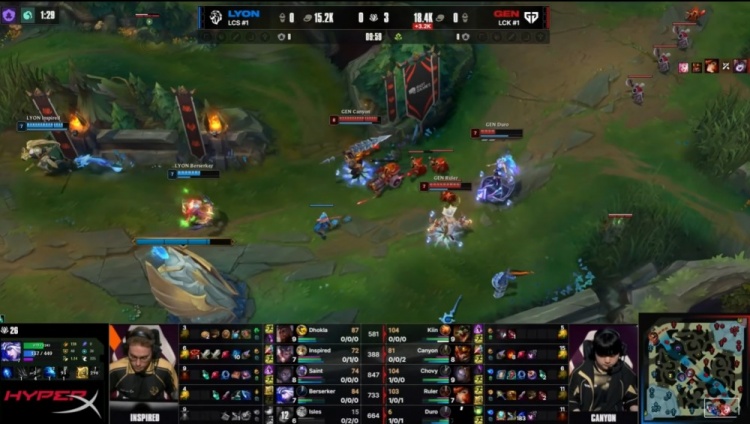 [19:00]GEN中路放出先锋推掉LYON一塔,并撞掉LYON中路二塔半血。inspired上河道又被GEN三人逮捕,GEN经济领先7k。