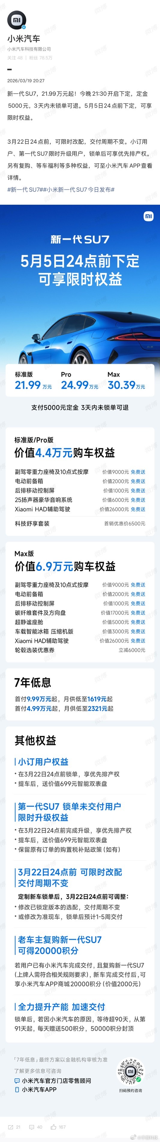 小米新SU7锁单后可限时改配新SU7锁单后可限时改配有条件很容易理解,毕竟在锁单之前其实有很多次机会修改,但是一旦锁单就好像买个东西,什么都定好了,厂家已经在排产了,你再去修改就不太合适了。说句不好听的,损失谁来承担?其次给的时间也非常充裕,从今天开始一直到22号之前都可以,也算是非常有诚意了。话说回来,今天的发布会看的非常过瘾。整体来说,等于是之前上一代出现的问题或用户不方便的地方,都在调整。大家的抱怨其它什么也好,小米都看到了。而且这也给了大家更多考虑时间,不用担心锁单后不喜欢也没办法改配。当然最好的还是想清楚,然后记好这两个条件,别万一怎么再后悔。