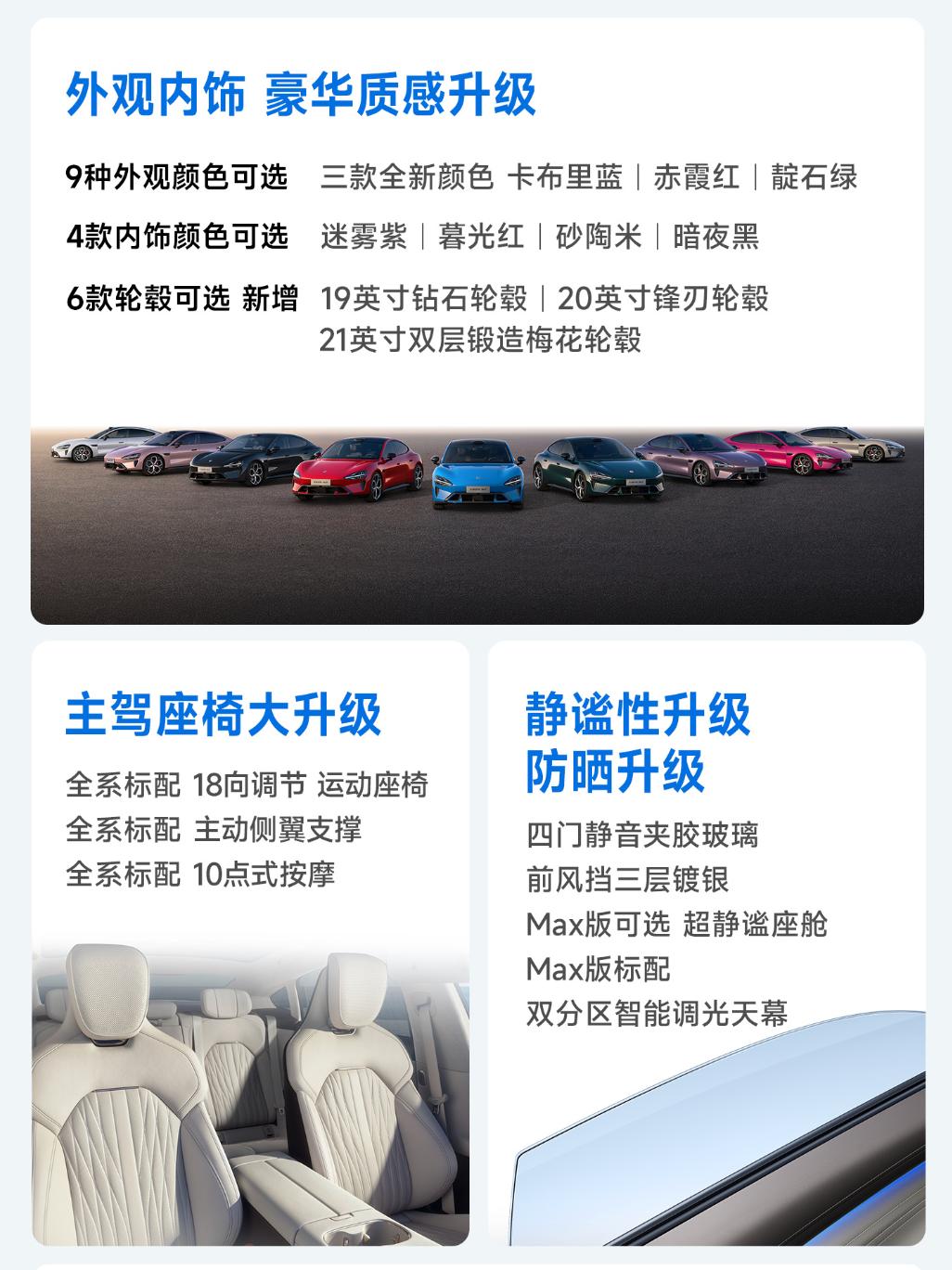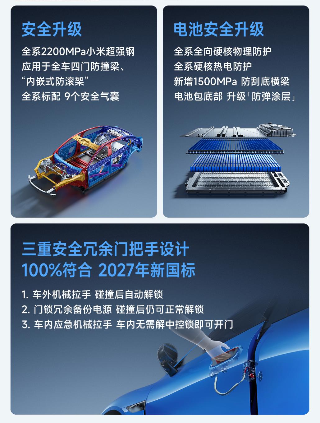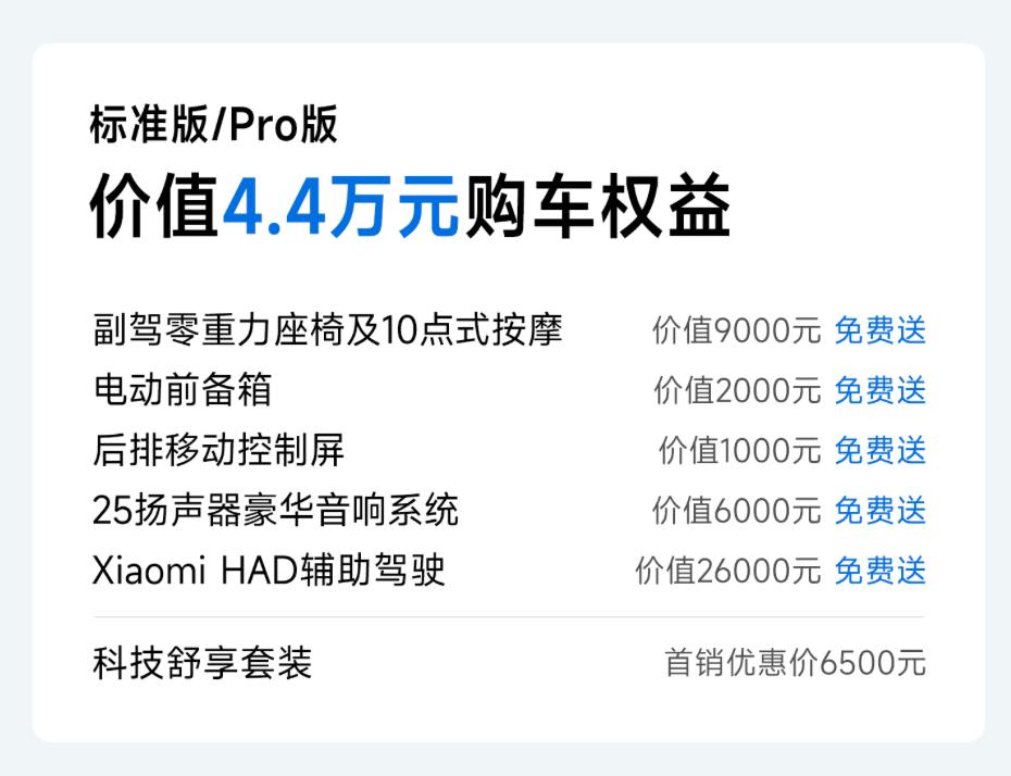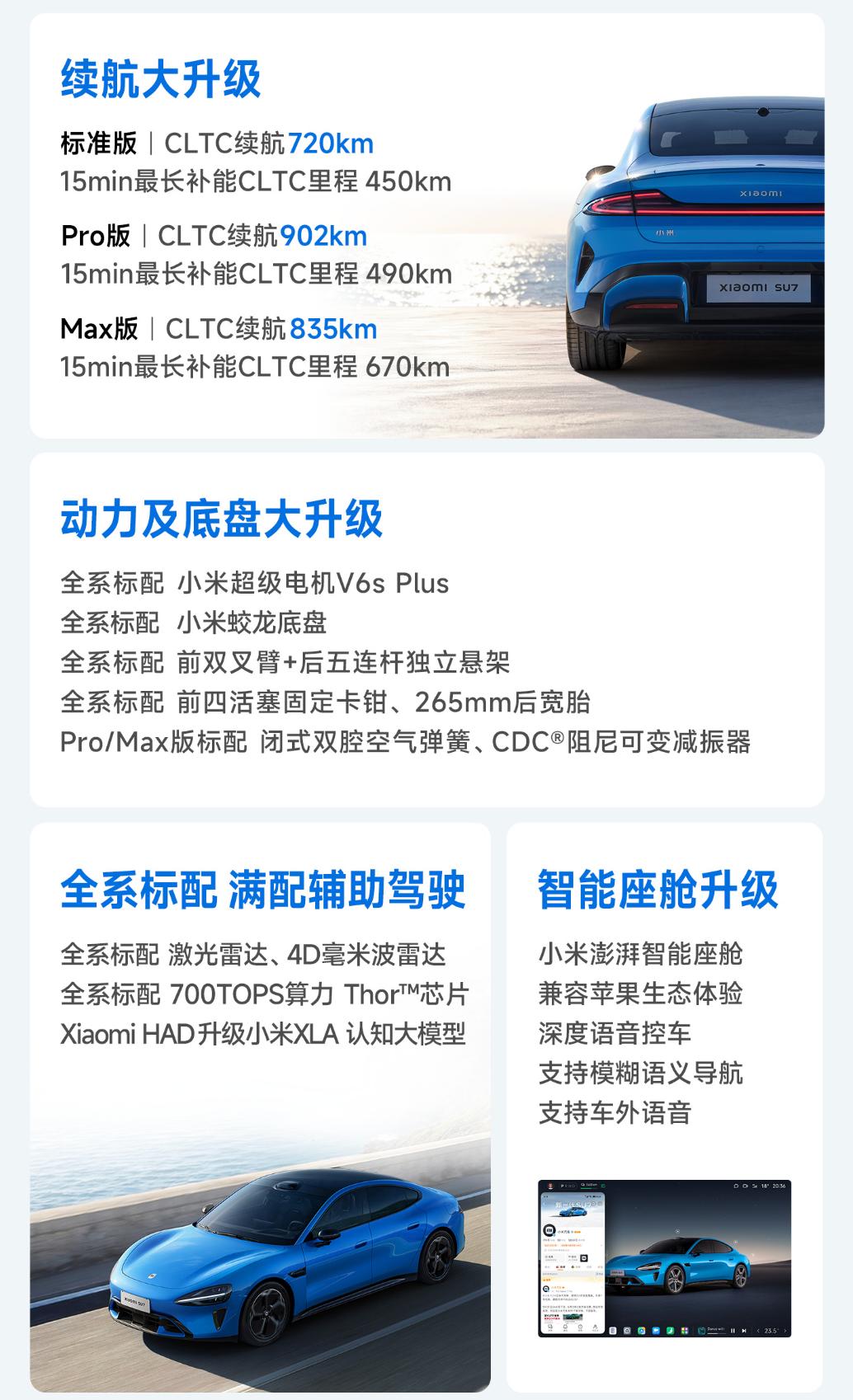 教授看完小米汽车发布会后得出一个结论,小米新一代SU7依旧是这个级别的标杆车型,并且还得到了全方位的进化,产品力相当出色! 来看看新车的基础信息! 车身尺寸:4997*1963*1445/1460mm,轴距:3000mm(中大型轿车) 驱动形式:纯电 电机功率:235/508kW(单电机/双电机) 电池类型:宁德时代/弗迪 电池容量:73/96.3/101.7kWh 电池平台:752/897v 电池续航:720-835-902km 智驾硬件:激光雷达*1/4D毫米波*1/超声波雷达*12/高清摄像头*1 智驾芯片:骁龙4nm/Thor 700Tops 智驾系统:小米HAD+XLA大模型 座舱系统:澎湃座舱 显示配置:16.1寸 3k中控屏/7.1寸翻转仪表屏/56寸HUD/后排娱乐屏 悬架:前双叉臂+后五连杆 底盘:蛟龙底盘+闭式双腔空悬+CDC可变阻尼 轮毂尺寸:19/20/21寸(前245后265) 外观配色:蓝/绿/红/紫/洋红/灰/白/金粉/黑 内饰颜色:米/紫/红/黑 隔音配置:四门静音玻璃(夹胶) 储存空间:前备箱105L/26处车内空间/9处磁吸空间 座椅:18向可调主座椅/副驾10向零重力座椅/后排睡眠头枕/前排座椅加热通风按摩 其他配置:9气囊/内置ETC模块/氛围灯/Nappa真皮方向盘/主动唯一/双区可调天幕/哨兵模式 21.99万 标准版 720km续航/752V/3.5C/73度电 零百5.28s/前四活塞卡钳/25扬声器/副驾零重力座椅/后排娱乐屏 24.99万 Pro版 902km续航/752V/3.5C/96.3度 零百5.7s/双腔空悬+CDC Max版 835km续航/897V/5.2C/电四驱/分区天幕 零百3.08s/101.7度电/21寸轮毂/布雷博卡钳/冷暖冰箱/碳纤维套件 对比第一代SU7,座椅有了较大的升级,底盘增加了双腔空悬、智驾增加了激光雷达、续航也大幅度提高了,属于常见的“小改款”升级,对比同行一年一升的变化,SU7的变化相对合理,价格从21.99万起,属于非常厚道的升级了。低配搭配了宁德时代三元锂电池,性能不用怀疑。 中配900公里续航满足对续航焦虑直接解决了,24.99万的售价也很吸引,还有弗迪电池加持。 高配属于续航和性能一起给,零百加速虽然已经不是最快的了,但零百3秒还有啥好怀疑的呢?所以30.39万的定价并不算贵,标杆依然是标杆啊。懂车帝车友圈